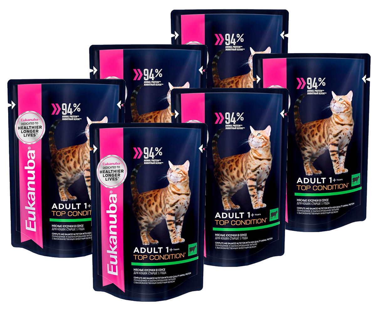 Влажный корм для кошек Eukanuba Top Condition, для здоровья кожи и блеска шерсти, с говядиной, 6 шт. х 85 г (кусочки в соусе)
