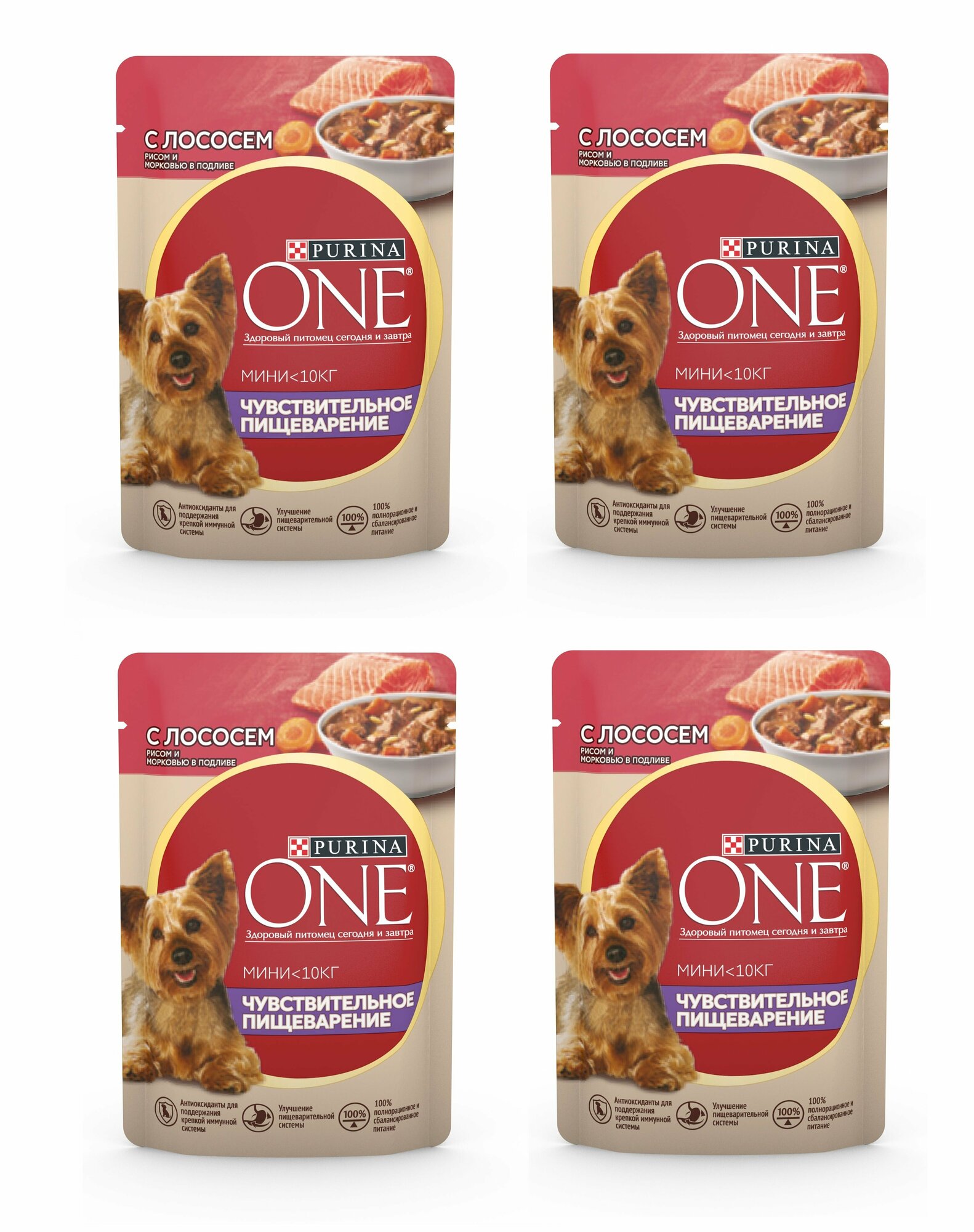 Купить Влажный корм Purina ONE Мини с чувствительным пищеварением, с лососем, рисом и морковью 85 г 4 шт