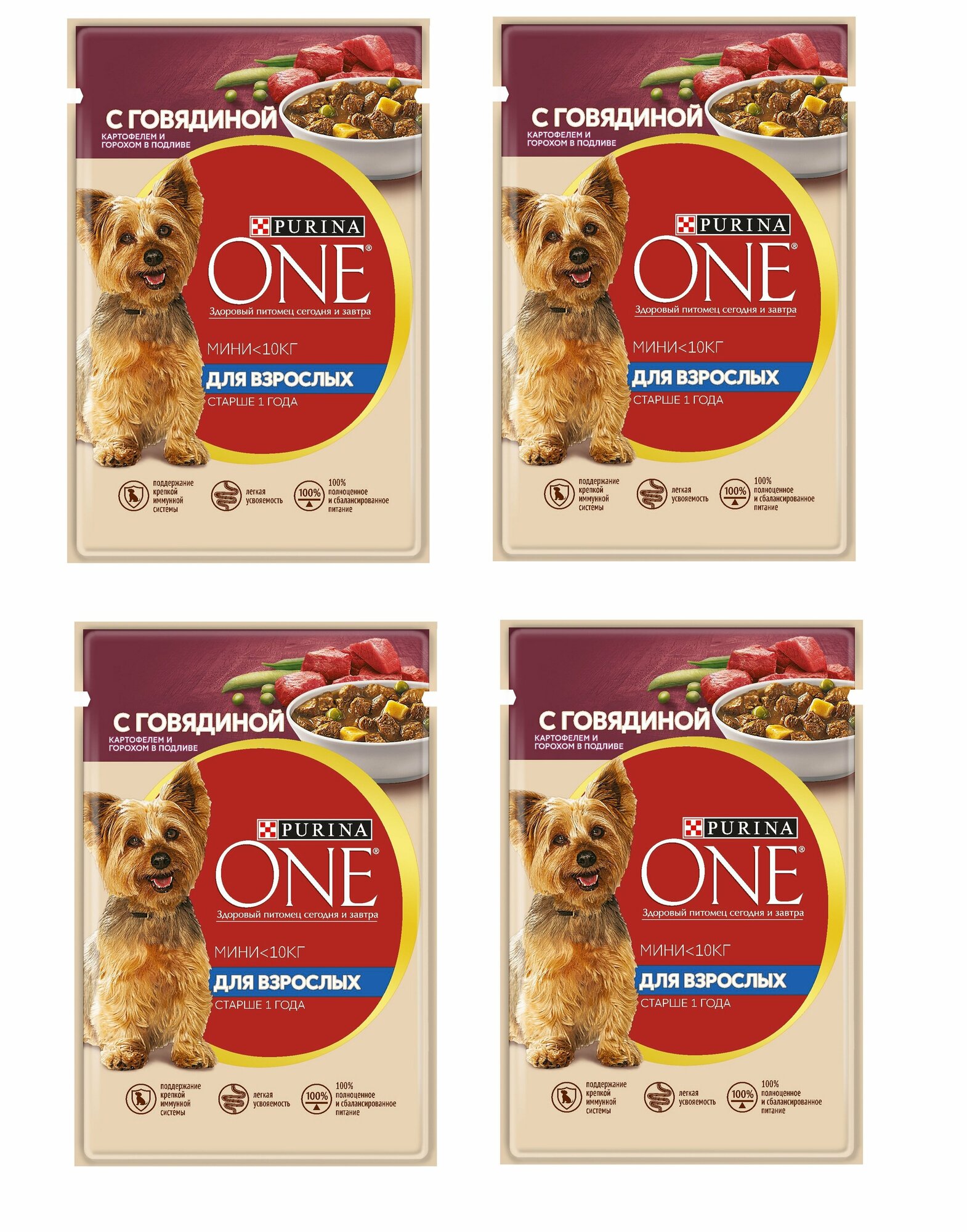 Купить Влажный корм Purina ONE мини для взрослых собак мелких пород, с говядиной, картофелем и горохом в подливе, 85 гр, 4 шт