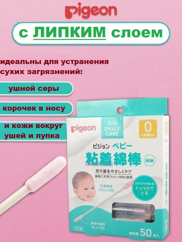 Купить PIGEON Ватные палочки BABY с липкой поверхностью 50 шт каждая в индивидуальной упаковке