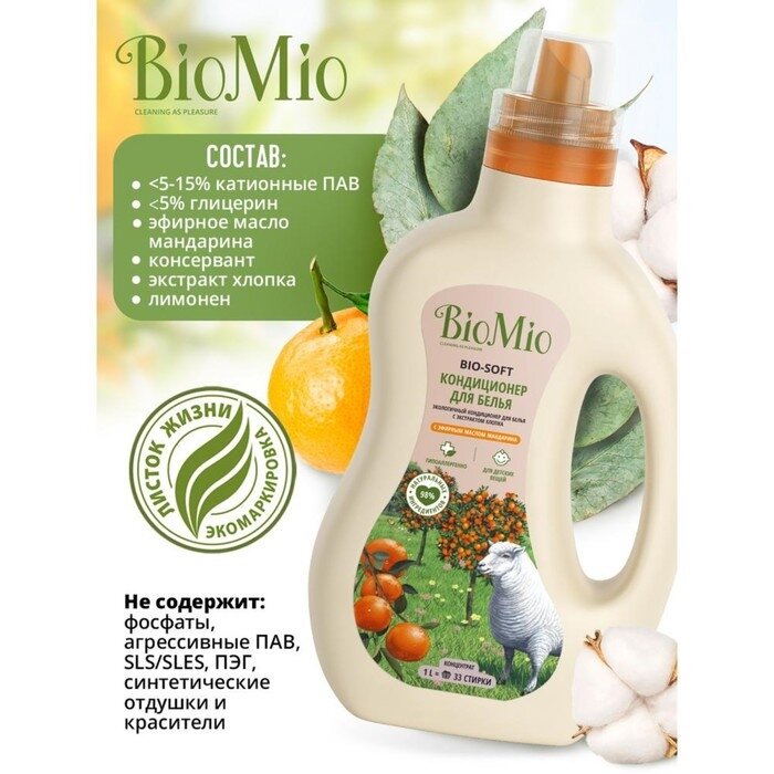 BioMio Кондиционер для белья BIO-SOFT с эфирным маслом мандарина и экстрактом хлопка, 1 л