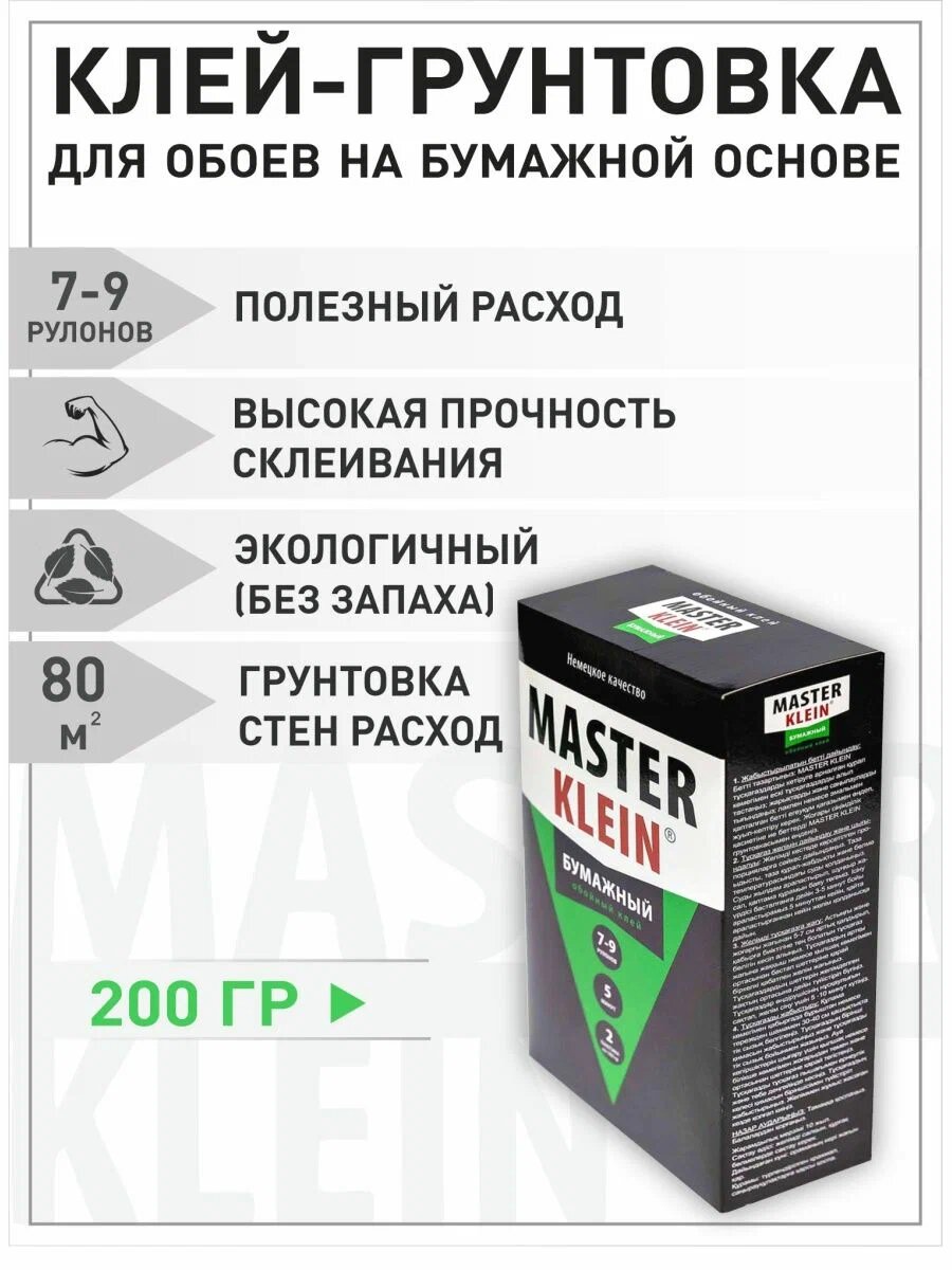 Клей обойный "Master Klein" для бумажных обоев 200гр (7-9рулонов, 40м2) жест.пачка