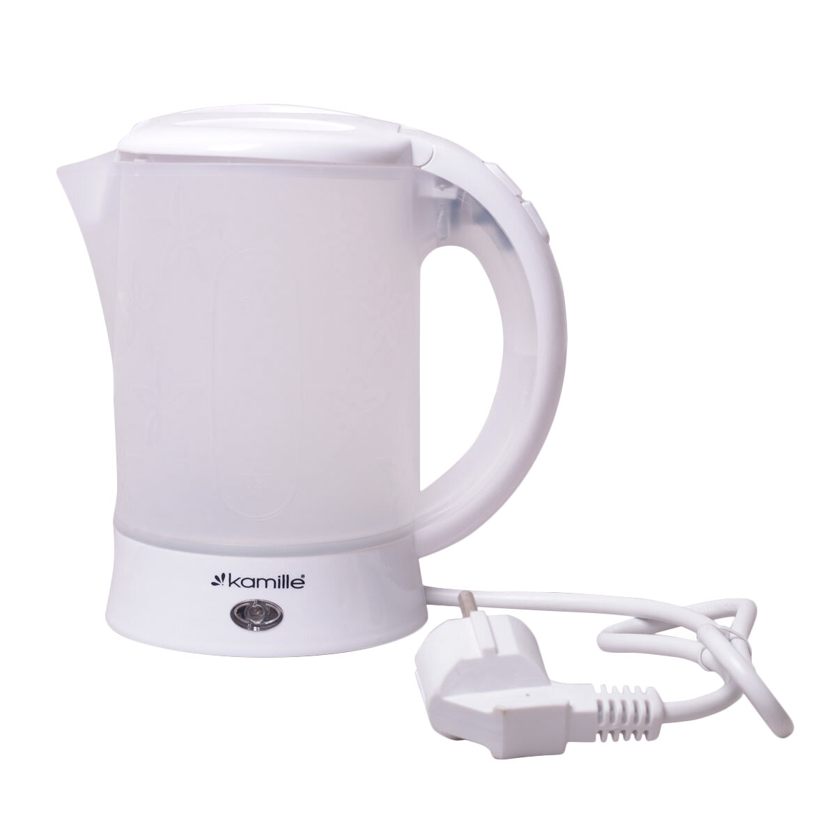 Чайник 0.6л электрический пластиковый, белый-матовый c чашками и ложками Kamille 1718A