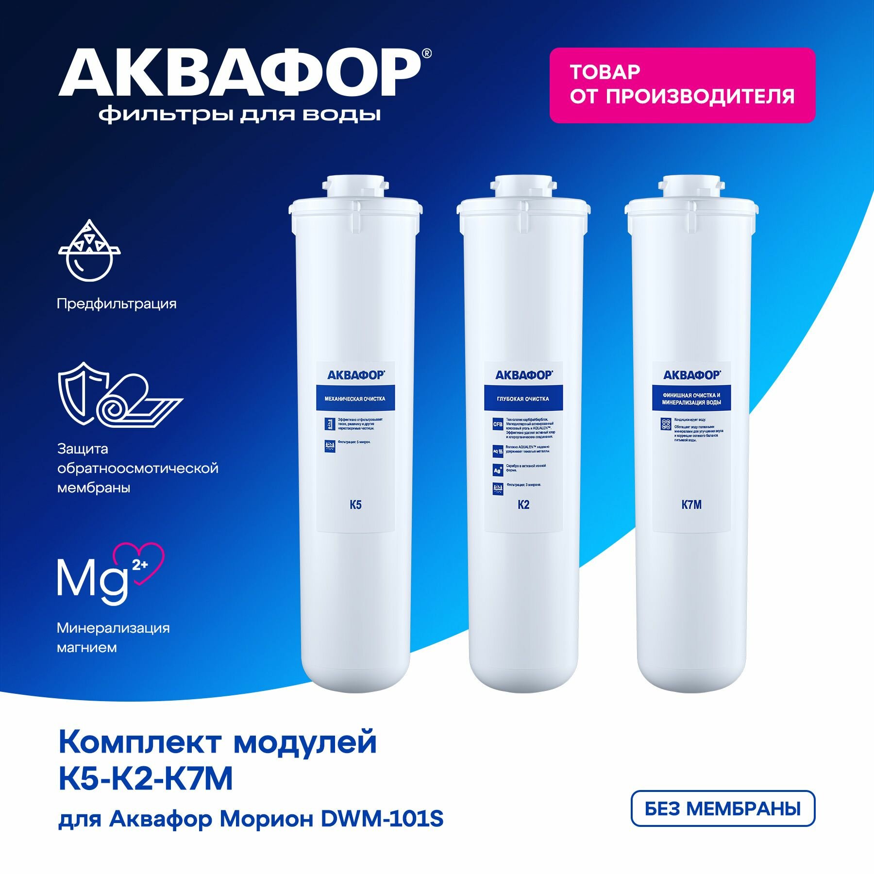 Купить Комплект картриджей / сменных фильтрующих, Аквафор К5-К2-К7М, З штуки без мембраны, для Морион DWM-101S