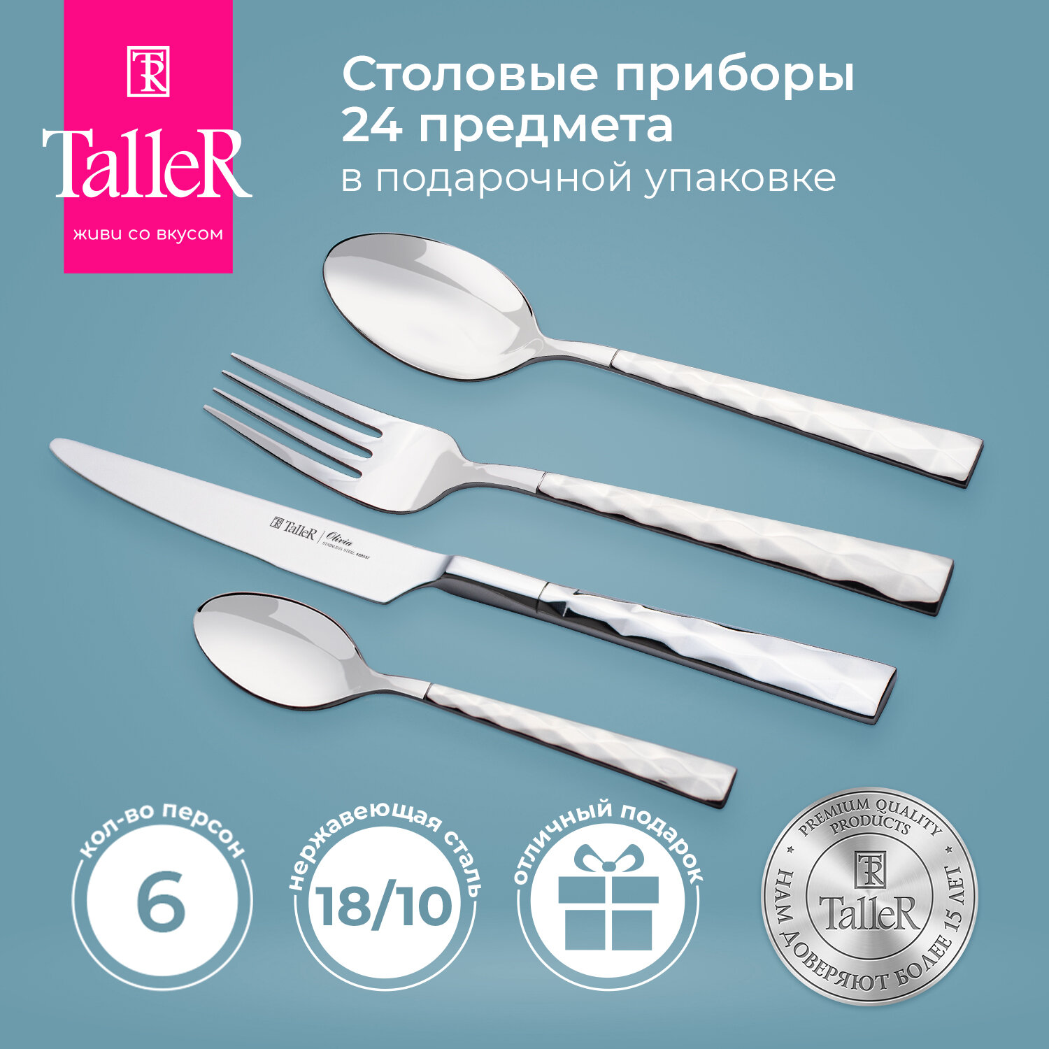 Набор столовых приборов нержавеющая сталь, 24 предмета, металлик, столовый, подарочная упаковка, Taller, TR-21605