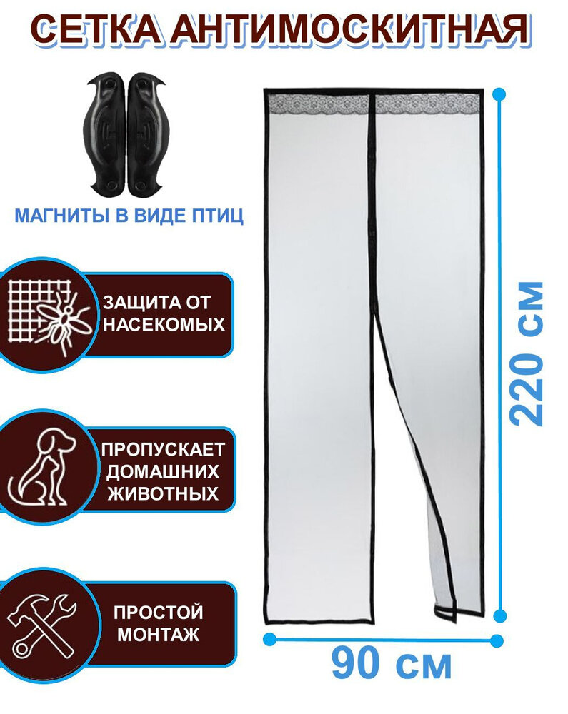 Антимоскитная сетка в дверной проем 210х100 см смыкается с помощью 9 пар магнитов, цвет - черный