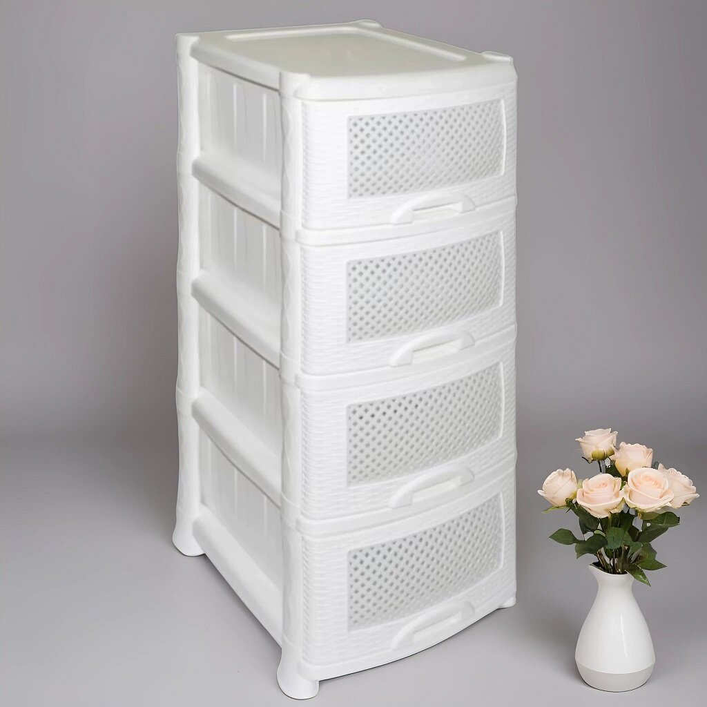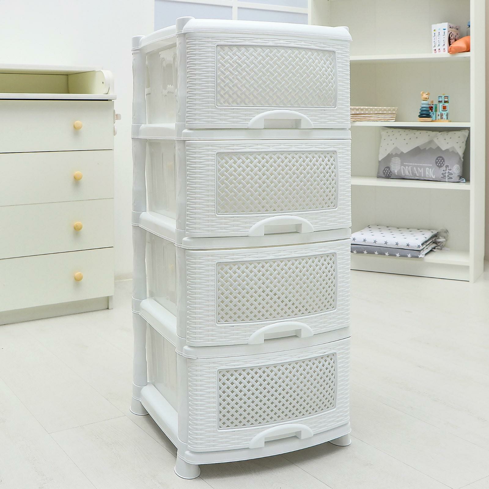 Комод пластиковый Плетёнка с 4 ящиками / универсальный стеллаж для хранения вещей / органайзер для аксессуаров, цвет белый