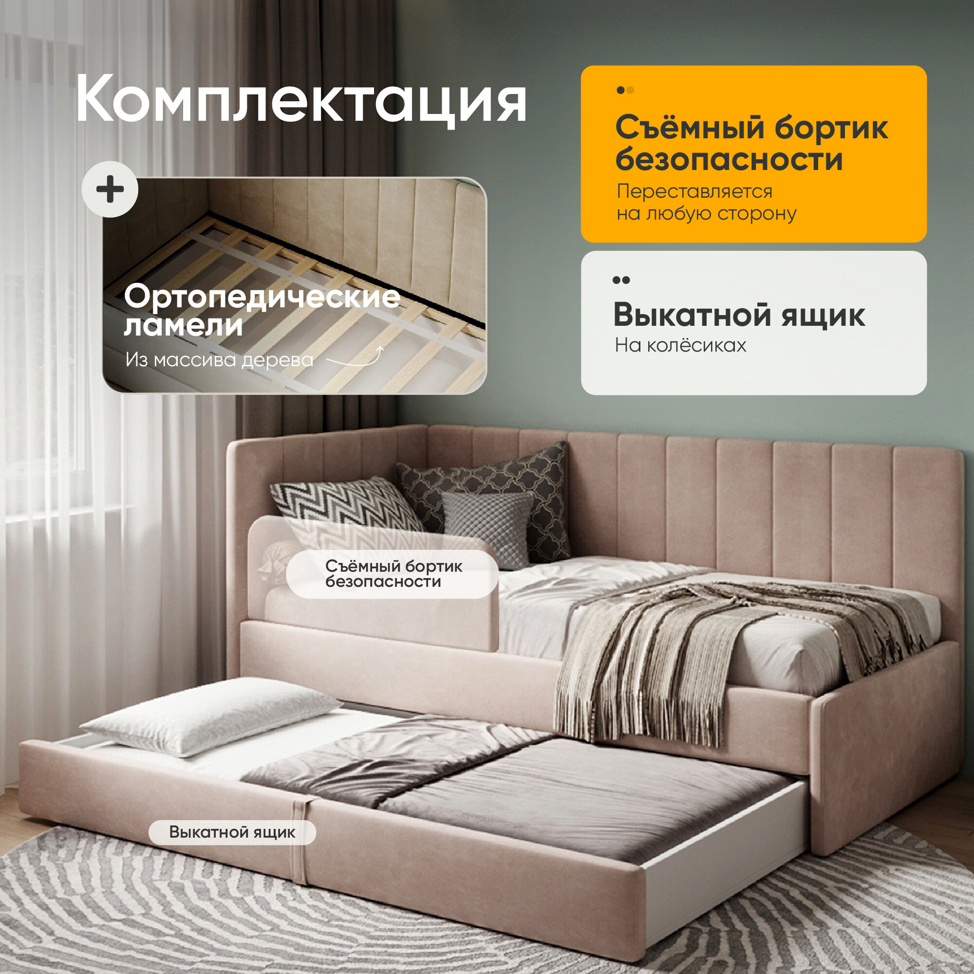 Кровать детская Huggy с защитным бортиком и выкатным ящиком 200х90 см, цвет Бежевый, диван кровать с мягким изголовьем