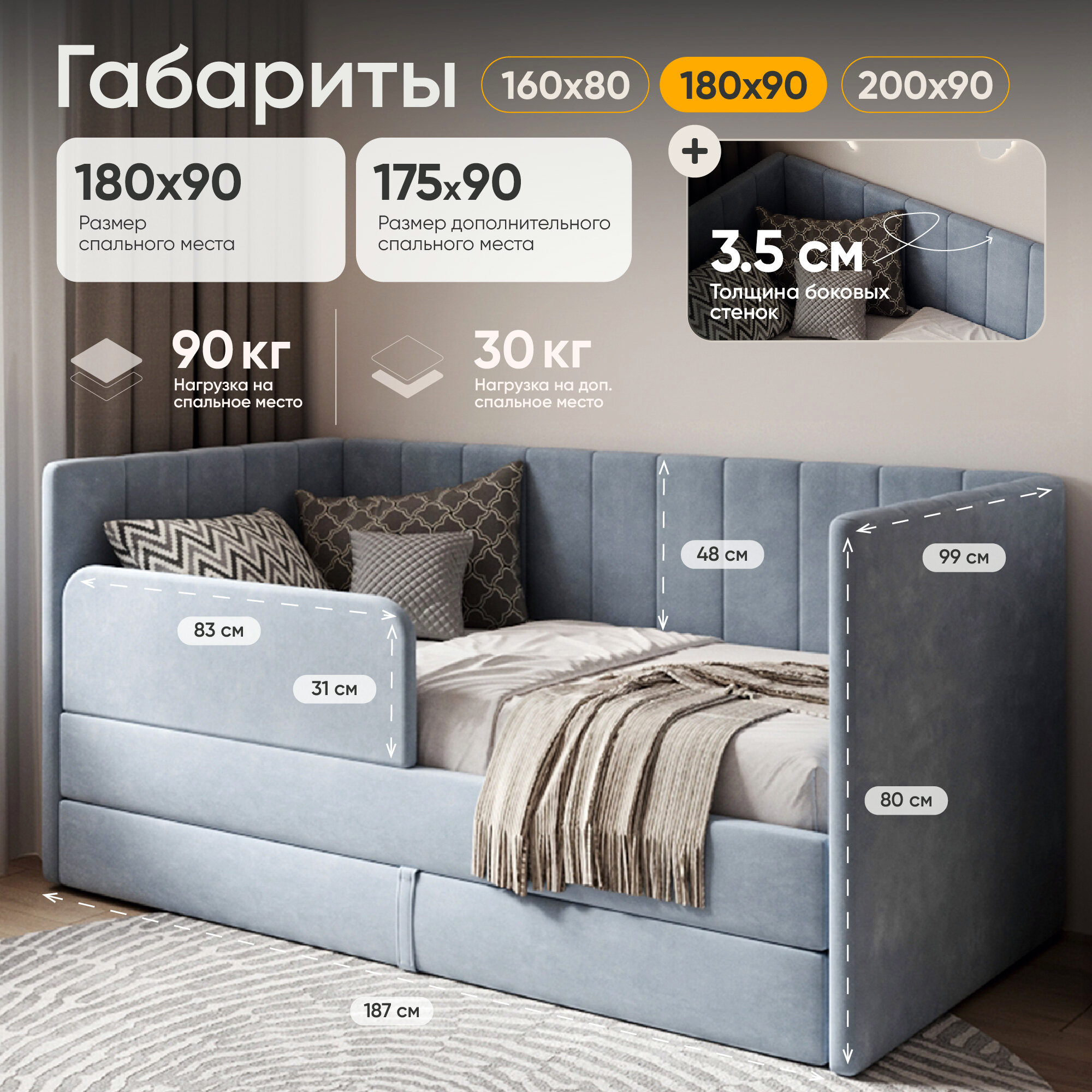 Кровать детская 180х90 см Huggy, цвет Голубой, диван-кровать выкатной от 3 лет, тахта кровать односпальная подростковая с ящиком и защитными бортиками