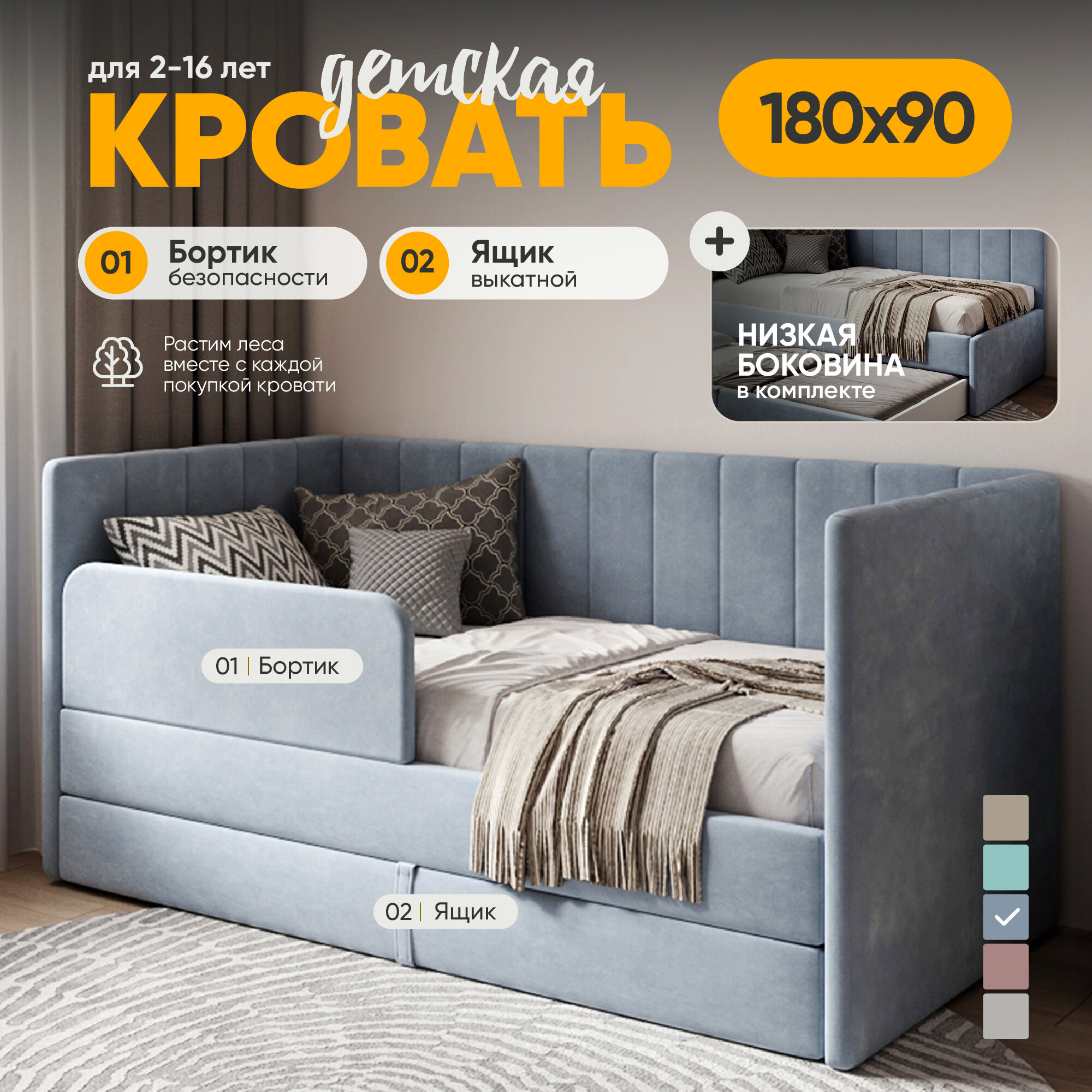 Кровать детская Huggy с защитным бортиком и выкатным ящиком 200х90 см, цвет Голубой, диван кровать с мягким изголовьем