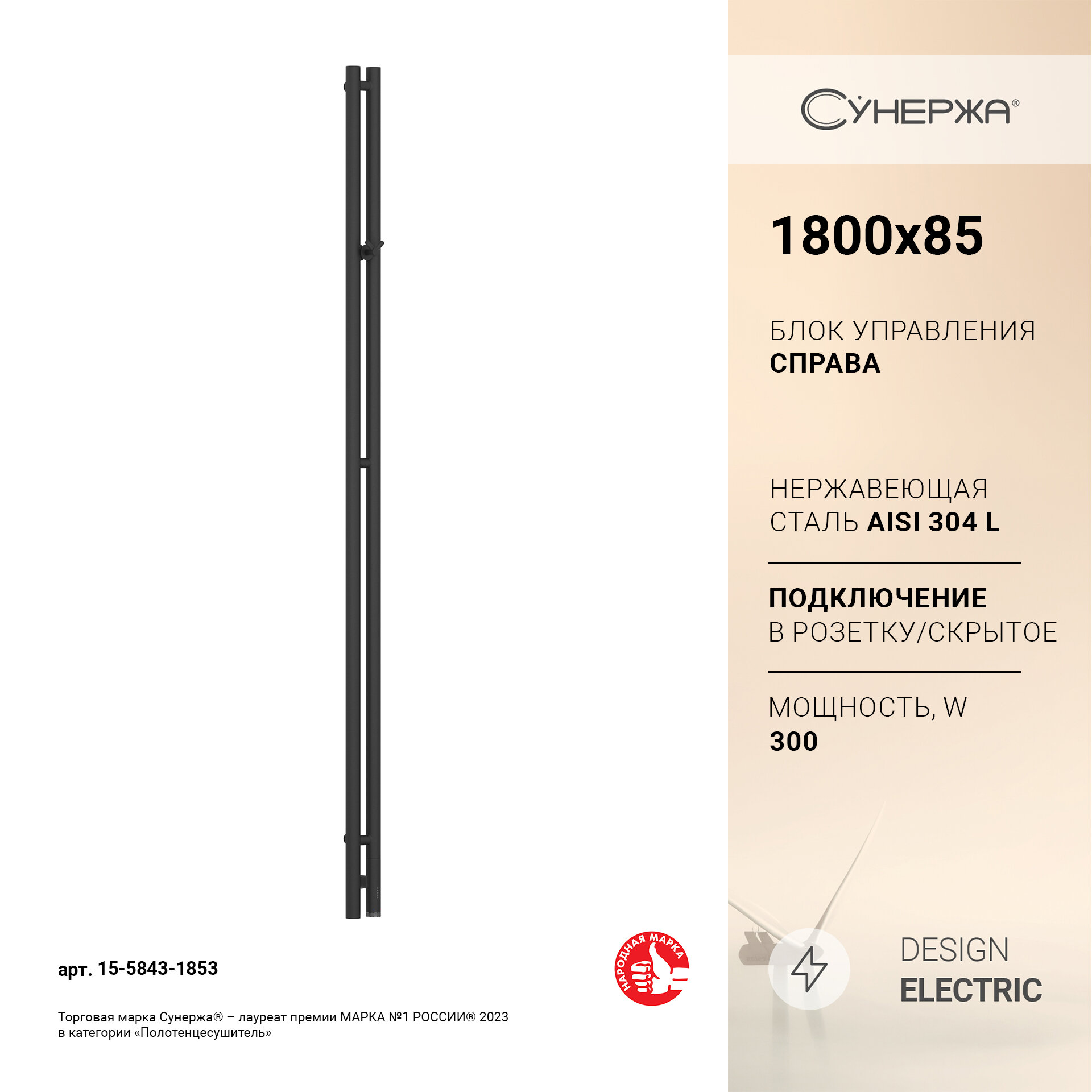 Полотенцесушитель электрический Сунержа Нюанс 3.0 1800 правый Матовый черный 31-5843-1853