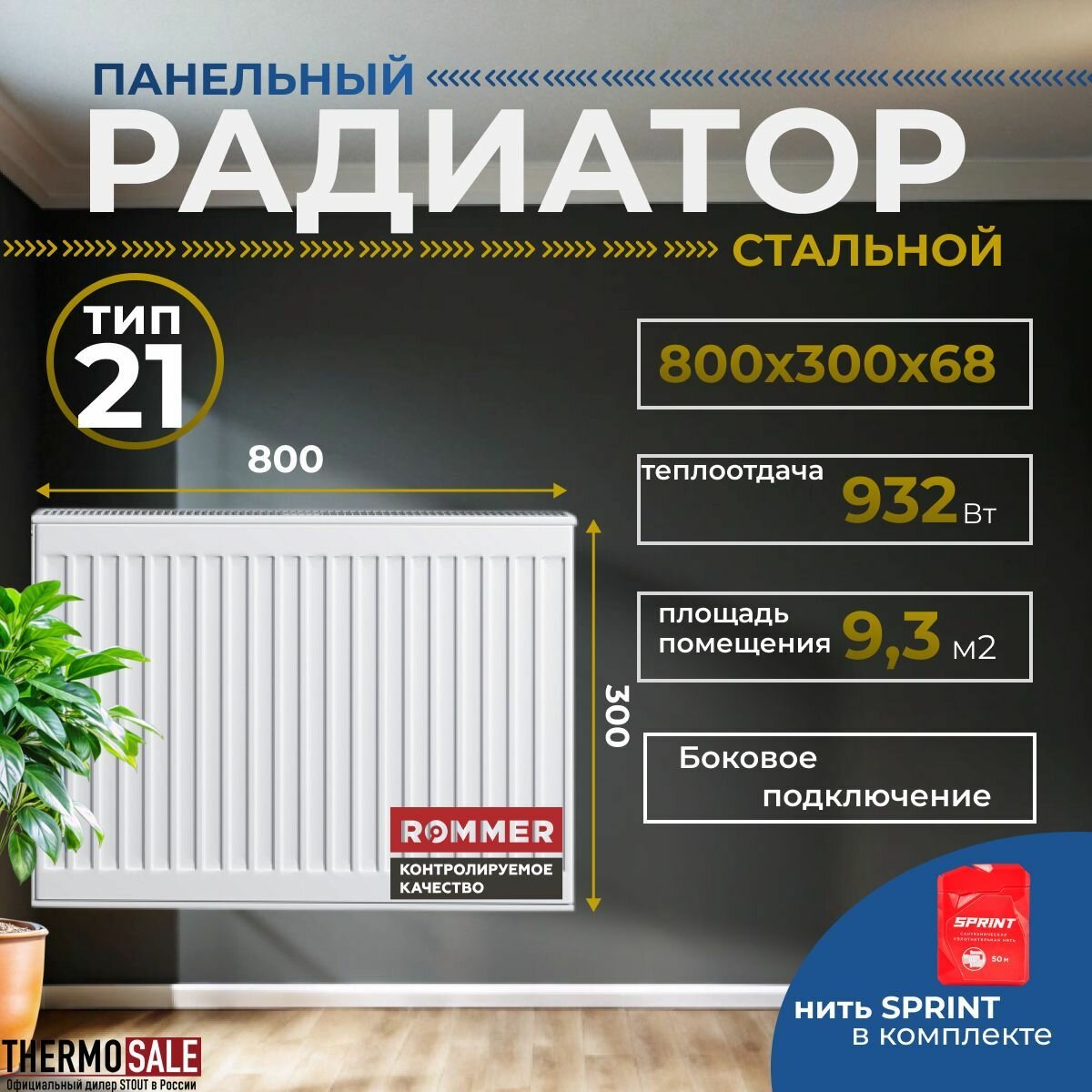 Радиатор стальной панельный ROMMER 300х300 боковое подключение Compact 21/300/900 Нить сантехническая