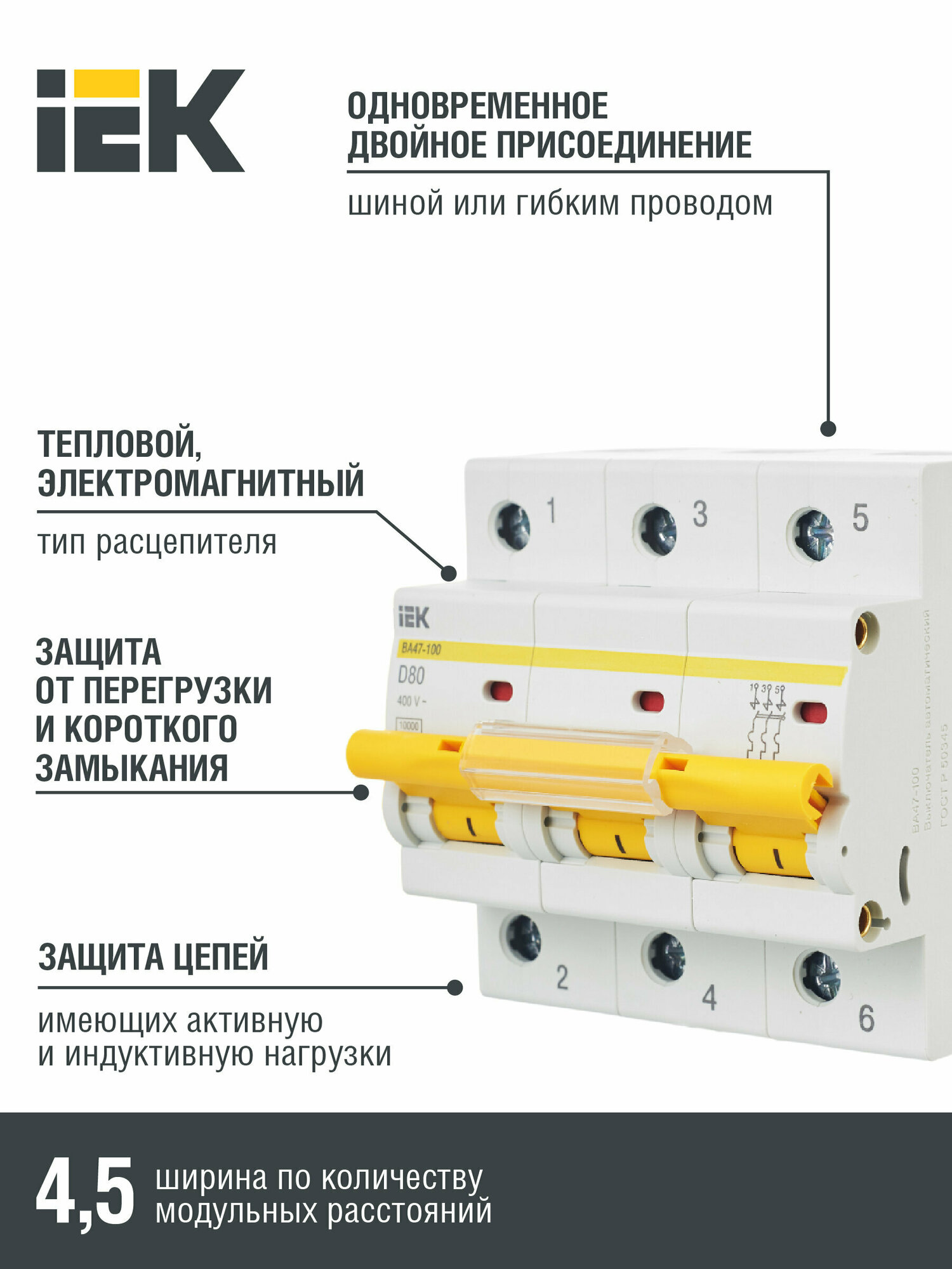 2шт. - Выключатель автоматический трехполюсный 80А D ВА47-100 10кА / IEK; арт. MVA40-3-080-D; оригинал / - комплект 2шт