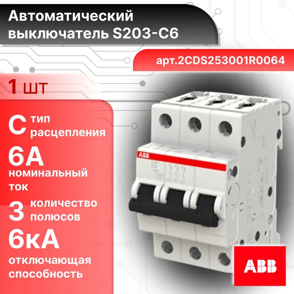 СохранитьАвтоматический выключатель 3п (3P) 6А тип C 6кА S203 ABB 2CDS253001R0064 1шт интересное: