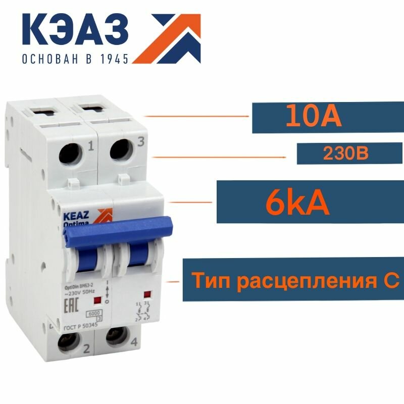 Купить Выключатель автоматический 2-пол. (2P) 10А C 6кА OptiDin BM63 КЭАЗ