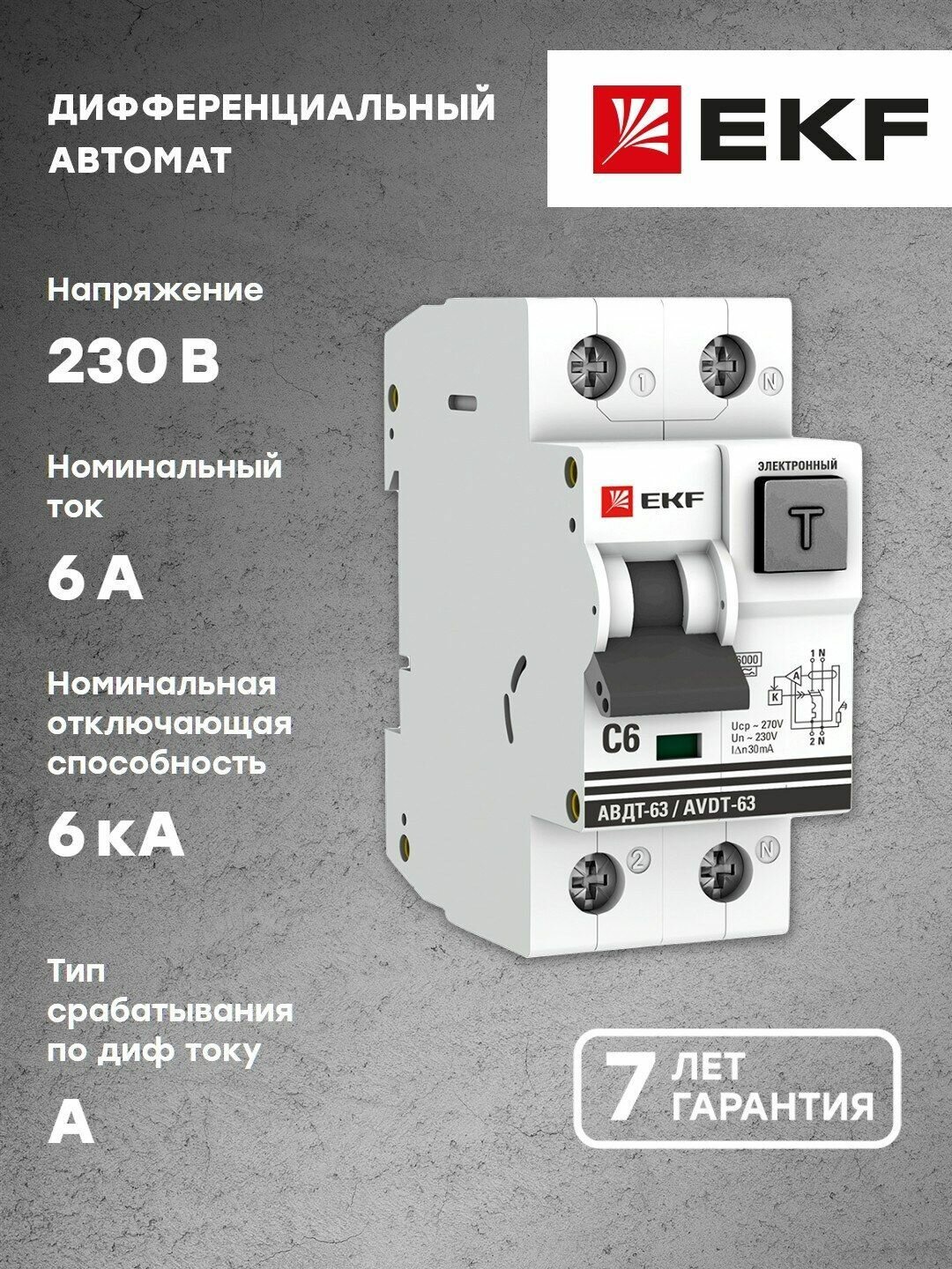 DA63-6-30e Дифференциальный автоматический выключатель EKF АВДТ-63 PROxima 1П+N 6А 30мА, тип А, 6кА, C, электронный