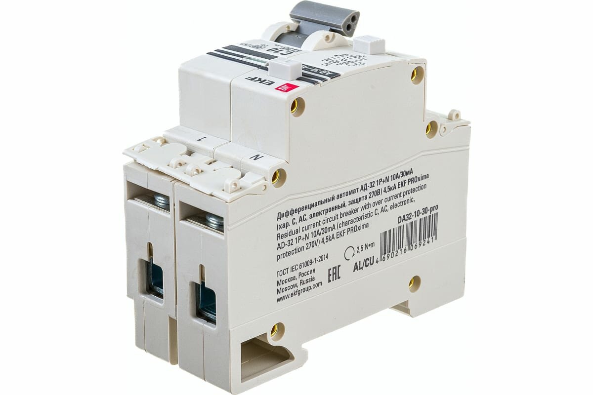 Выключатель автоматический дифференциального тока АД-32 10А (1P+N) двухполюсный характеристика C 4,5kA 30мА тип AC электронный PROxima DA32-10-30-pro EKF