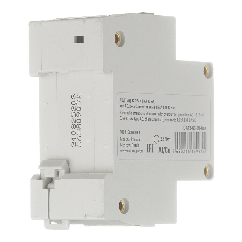 Автомат дифференциальный EKF Basic АД-12 63А 30 мА 1P+N тип АС 4,5 кА (DA12-63-30-bas)