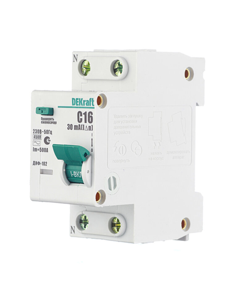 Купить DEKraft ДИФ-102 Дифференциальный автоматический выключатель 1Р+N 16А 30мА тип AC (С) 4,5кА