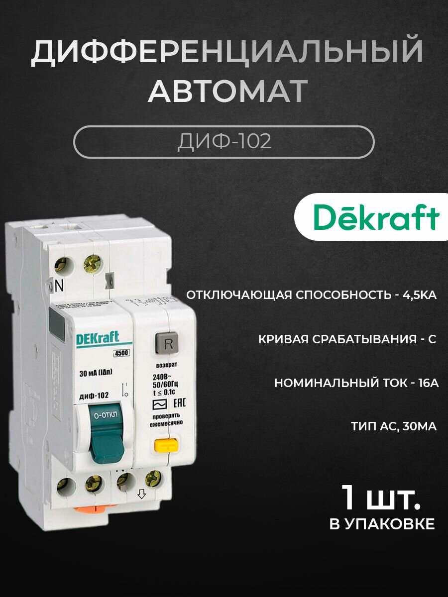 Диф. автомат DEKraft 1Р+N 16А 30мА тип AC х-ка С ДИФ-102 4,5 кА