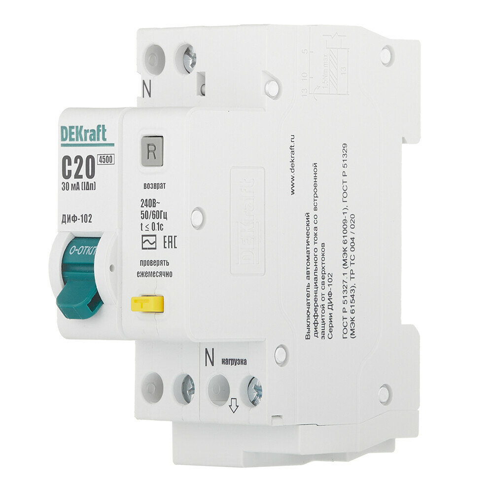 Автомат дифференциальный Dekraft ДИФ-102 20А 30 мА 2P тип АС 4,5 кА компактный (16004DEK)