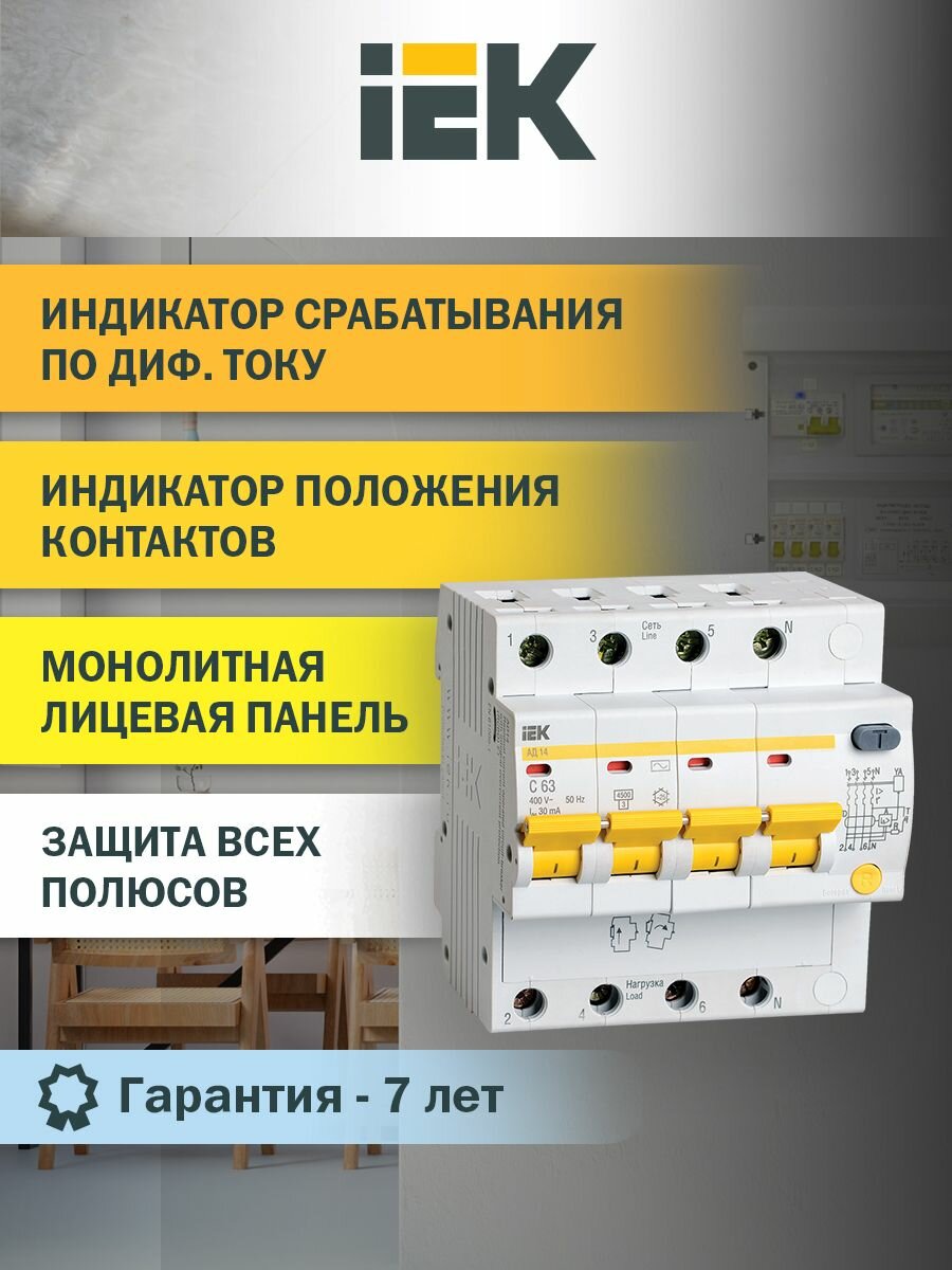 Дифференциальный автомат IEK АД14 4П 30 мА C 4.5 кА AC электронный 63 А