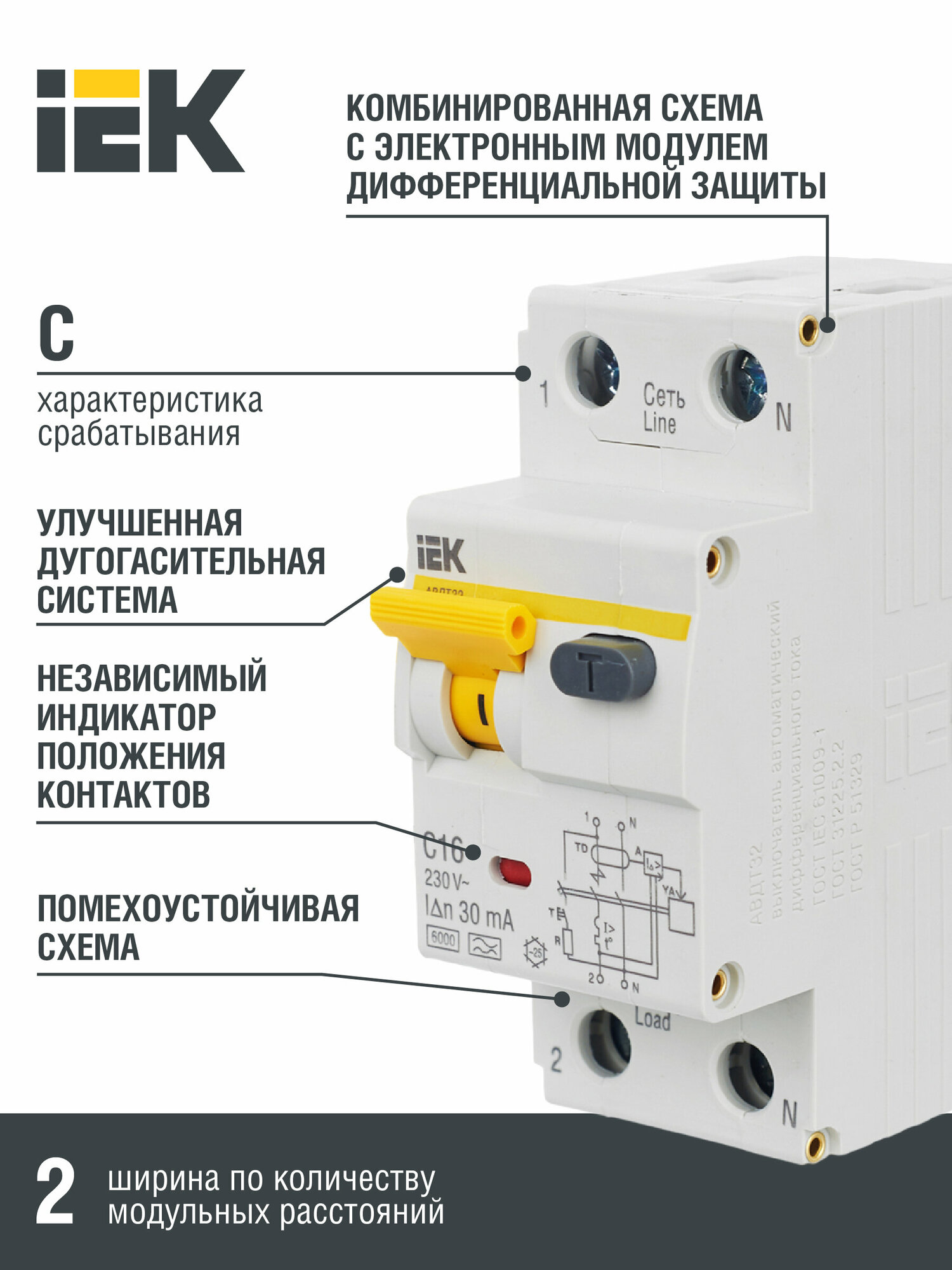 Выключатель IEK автоматический дифф. тока АВДТ 32 6A тип C 6kA 30мА A 1П+Н 230В 2мод белый (упак.:1шт)