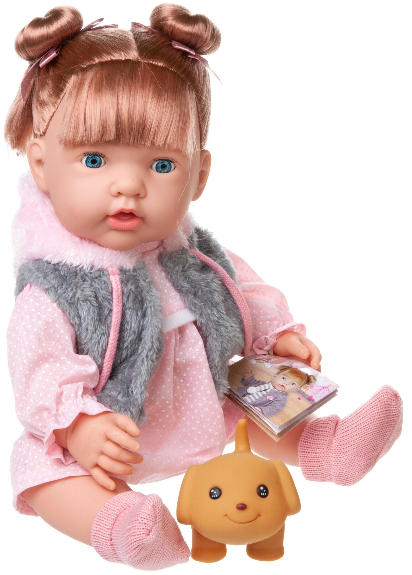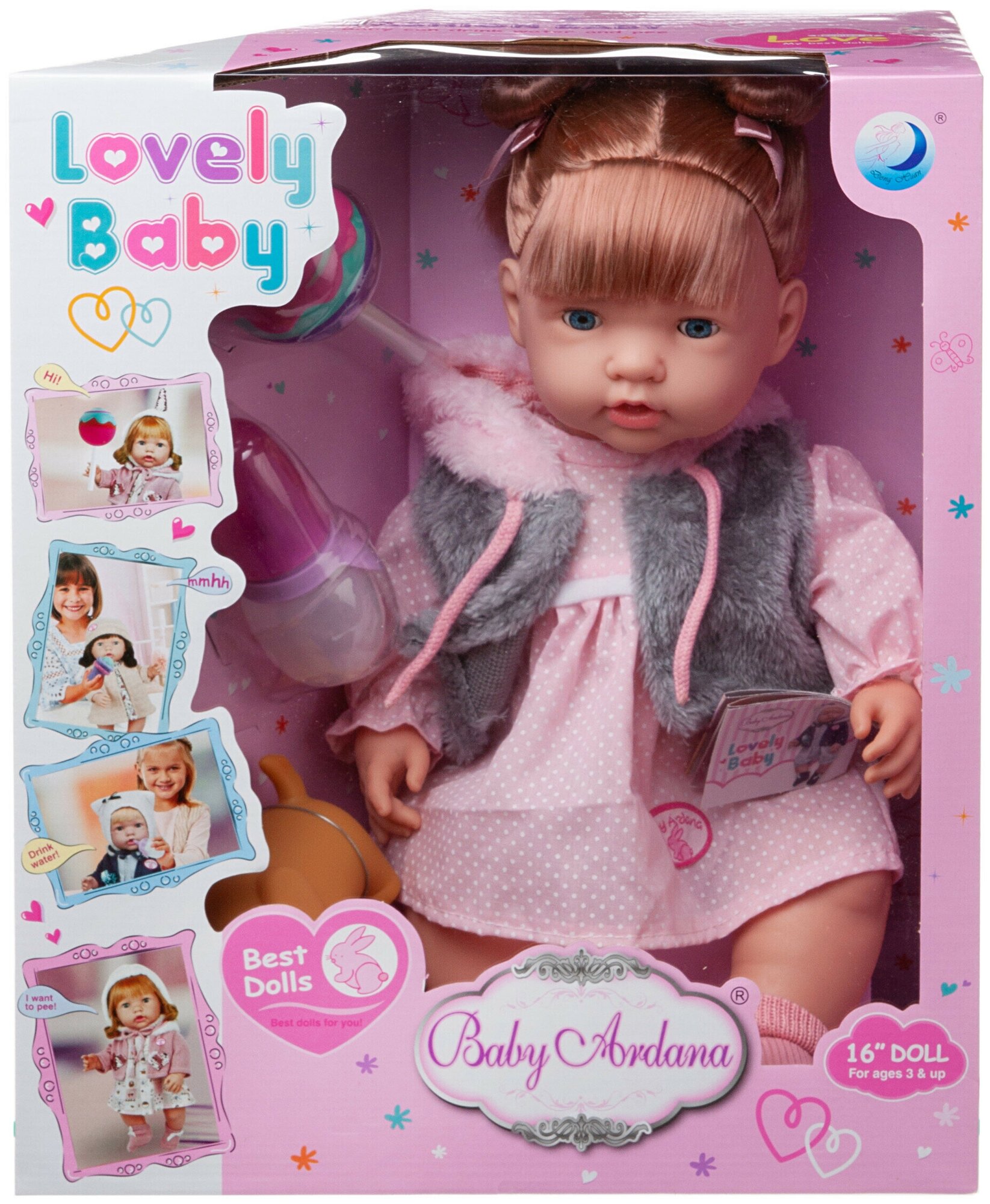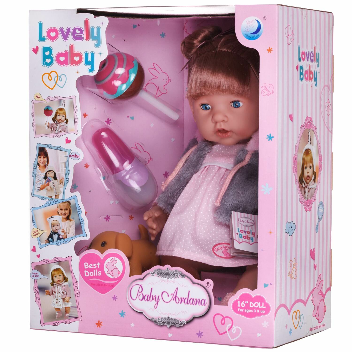 | Комплектация | пупс-девочка, бутылочка, любимая игрушка "Собачка", конфетка на палочке |