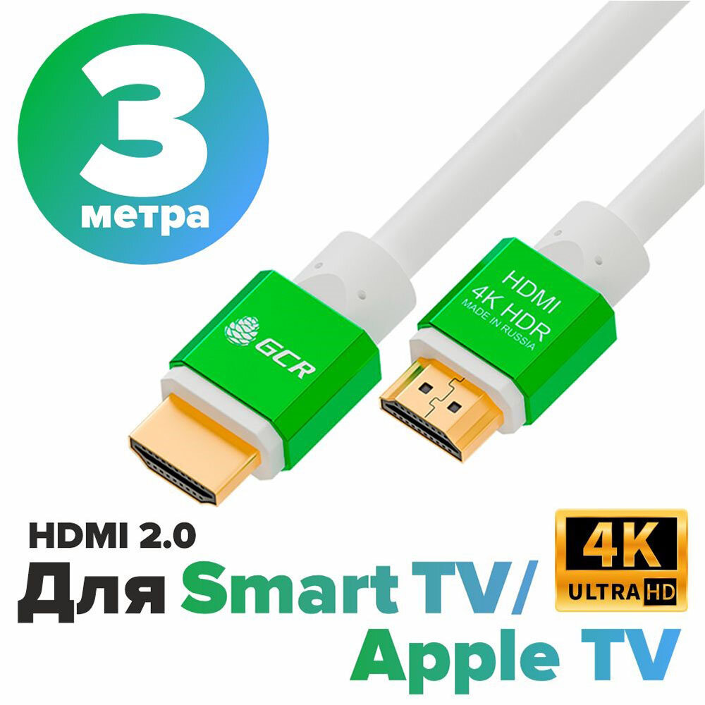 HDMI кабель GCR 3м Ultra HD 4K 60Hz 3D белый с зелеными коннекторами 24K GOLD для монитора проектора