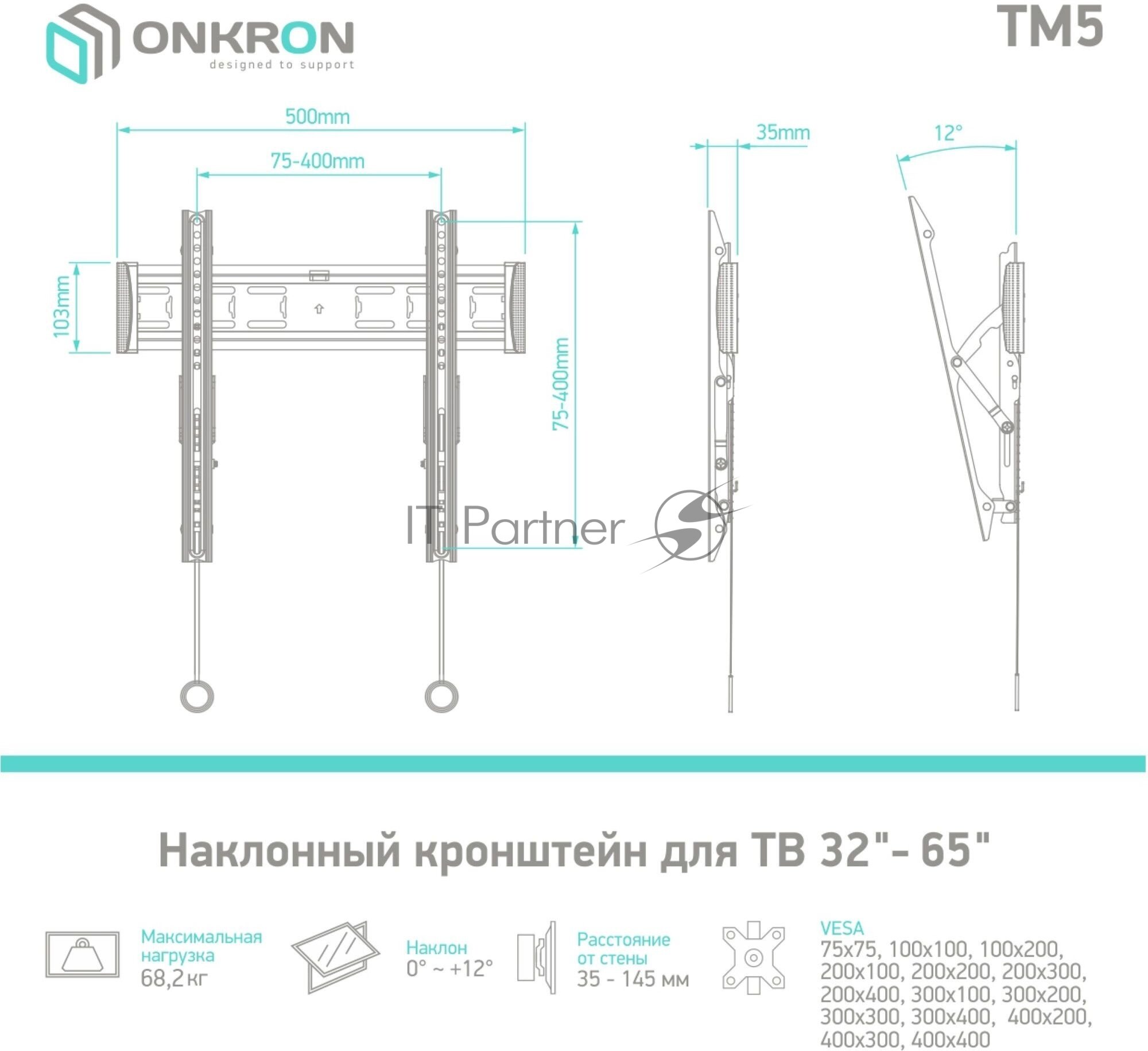 Кронштейн Onkron Tm5, для ТВ, наклонный, 32"-65", 35-145 мм от стены, черный 9299132 .