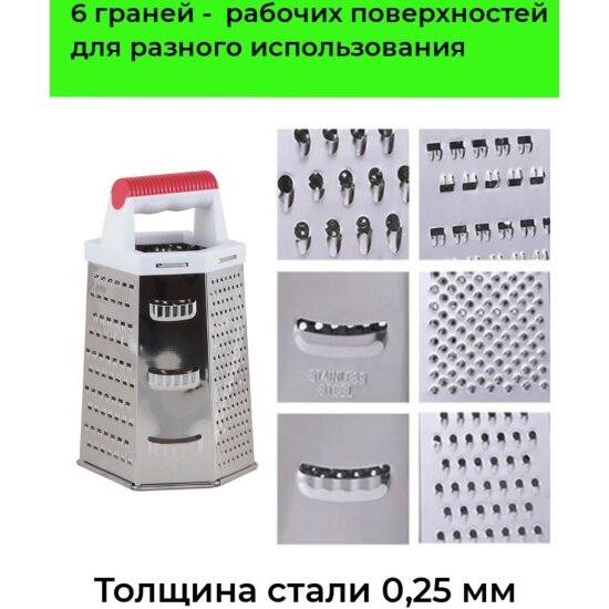 2) 6 граней для всех случаев и способов приготовления блюд. 3) Хороший материал, главным преимуществом которого является его стойкость и невозможность вогнуть грань тёрки. |