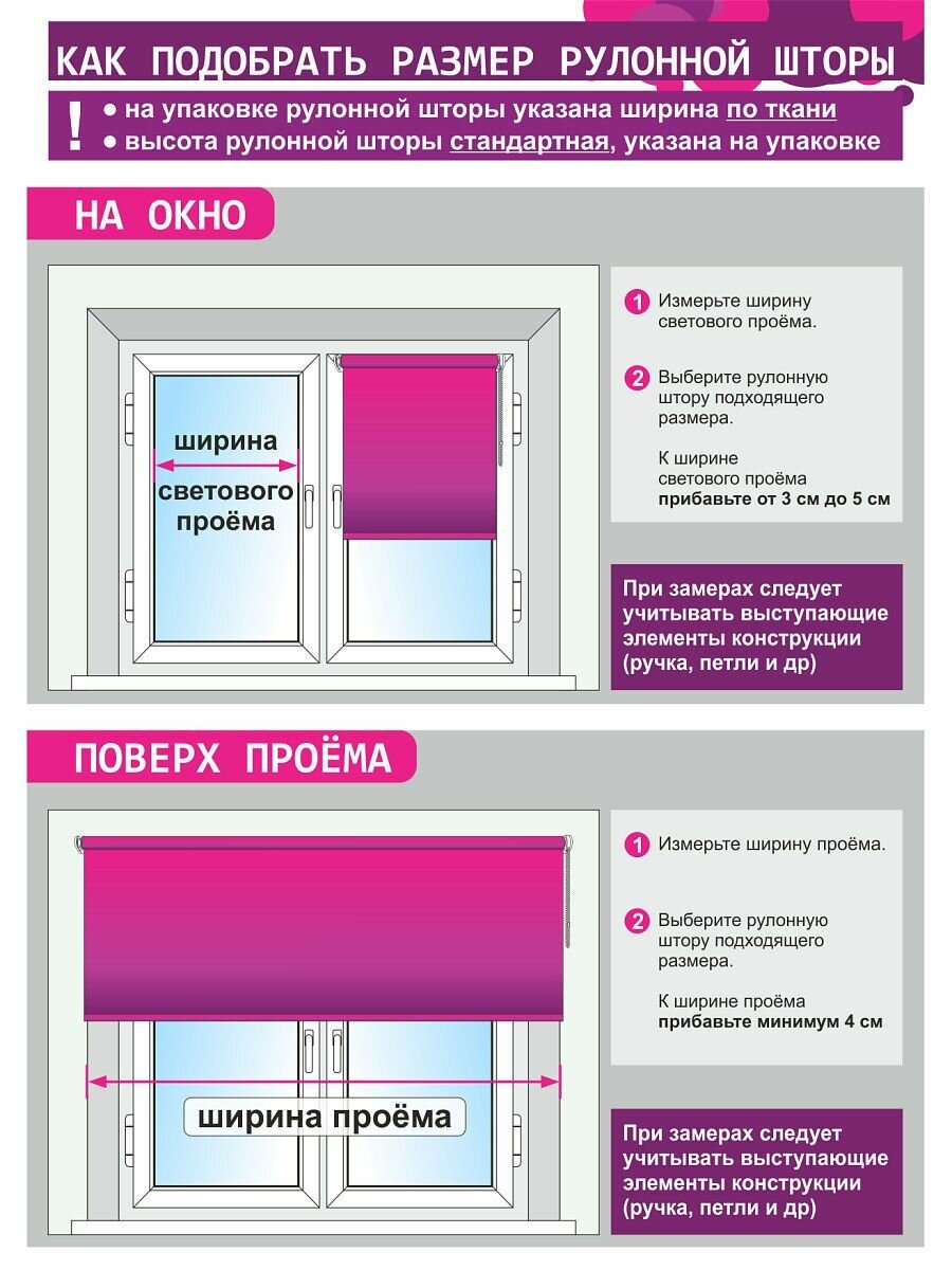 | Отзыв: | На окно (от рамы до рамы внутри проема) 60см нужно брать штору 57см. Я взяла 60см для установки внутри рамы но теперь буду или укорачивать штору или крепить на наружную раму |