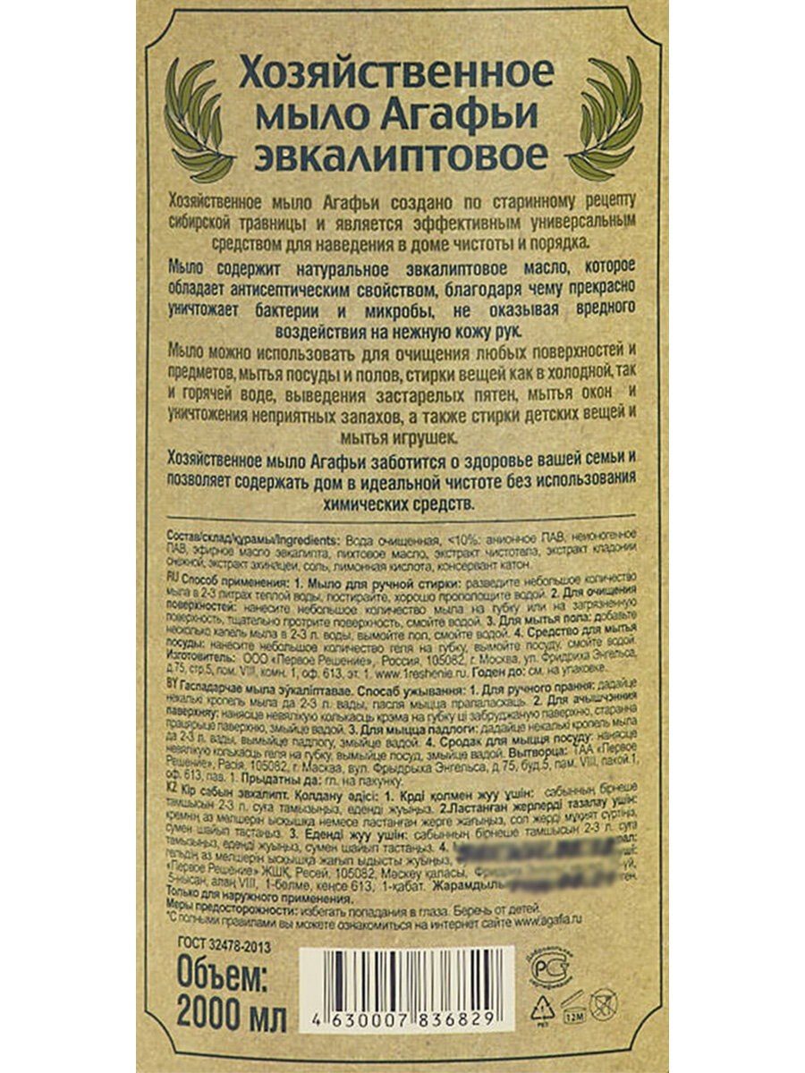 "РБА" мыло хозяйственное Агафьи эвкалиптовое 2 л.