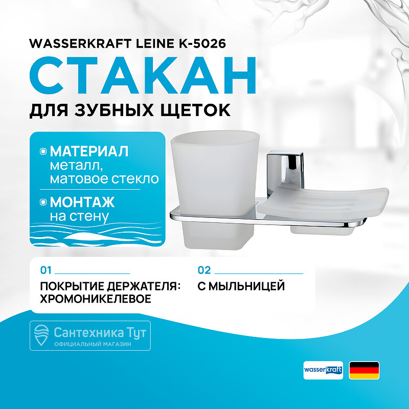 СохранитьДержатель стакана с мыльницей Wasserkraft Leine K-5026 хром, стекло матовое интересное: