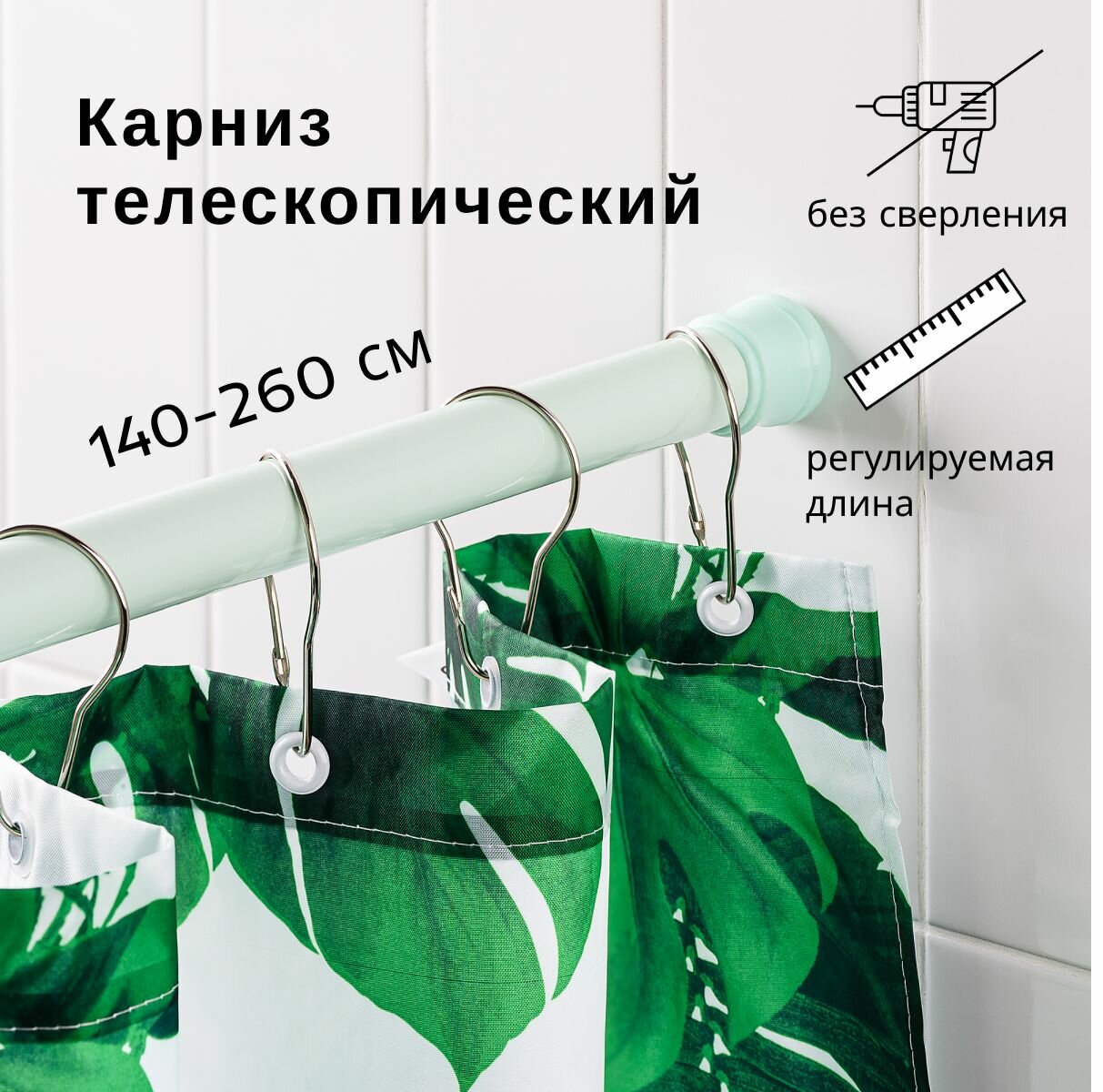 | Минусы: | Крючки постоянно цепляются за стык двух палок и соскакивают. Основная труба коротковата (минимальная длина - 100 см), поэтому через стык проходит не 1-2 крючка, а 3-5 при длине ванны 160 см. Приходится придерживать руками. |