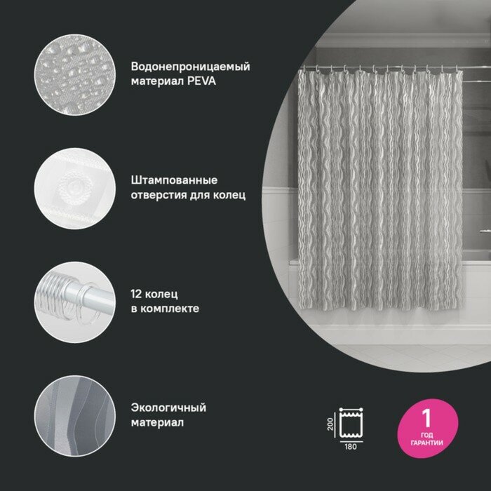 Штора для ванной комнаты и душа IDDIS Base BS01P18i11 водоотталкивающая, из полиэстера, серая, с люверсами, с кольцами