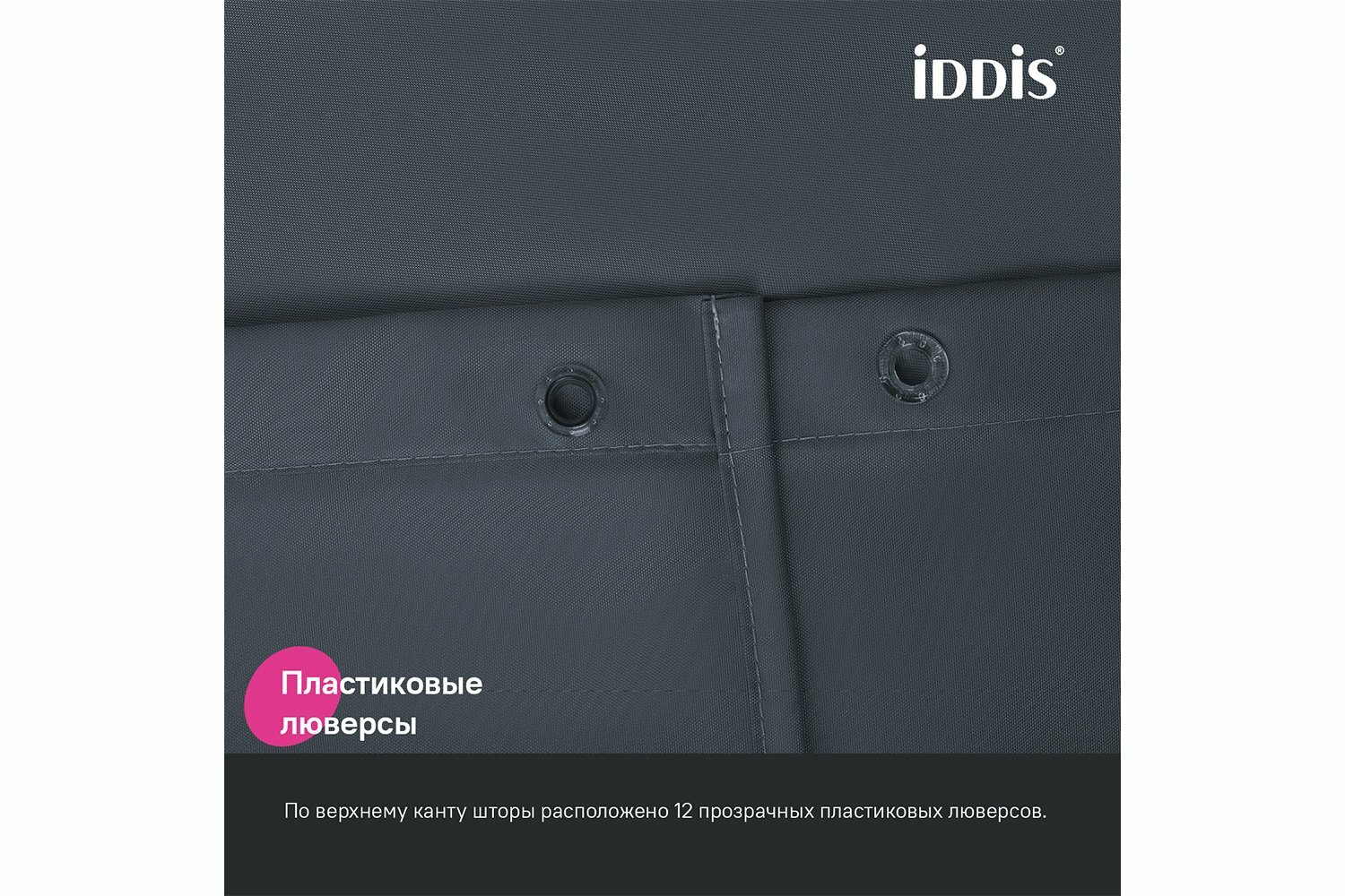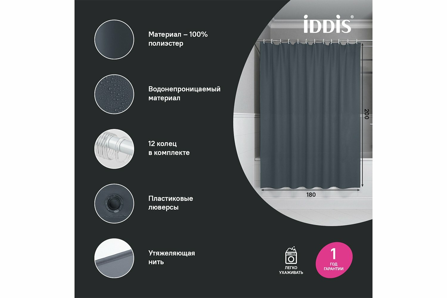 Купить Штора для ванной комнаты и душа IDDIS Base BS01P18i11 водоотталкивающая, из полиэстера, серая, с люверсами, с кольцами