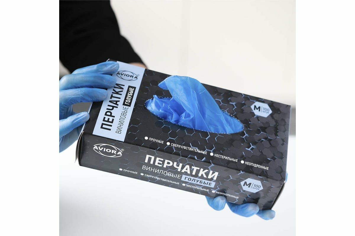 Перчатки виниловые, голубые, неопудренные, одноразовые, размер M, 100 шт. в упаковке, AVIORA (402-916)