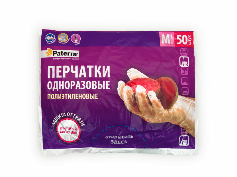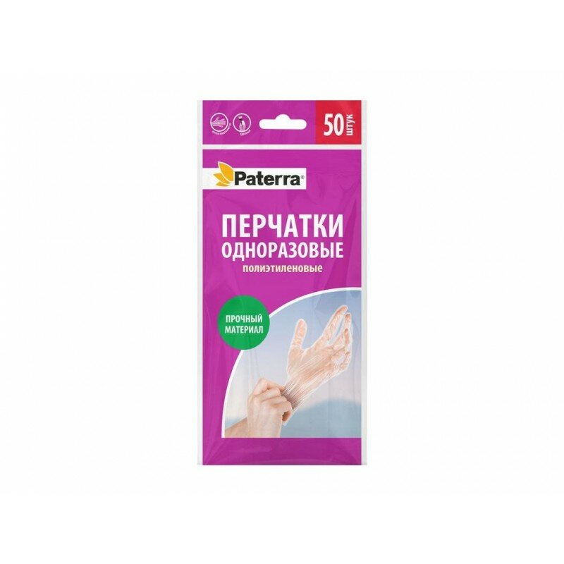 Одноразовые полиэтиленовые перчатки PATERRA, 50 шт. в упаковке, размер М, 402-037