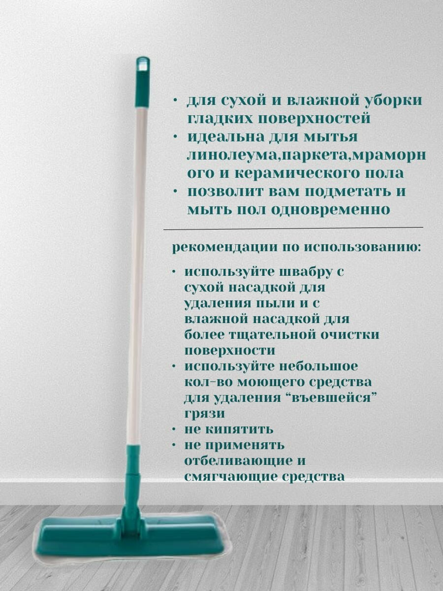 Швабра- инструмент для уборки и наведения чистоты, а значит предполагает активный контакт с водой. Рано или поздно, приклеенные предметы при постоянном контакте со влагой отклеиваются. 2. Короткая ручка. В разложенном ( вытянутом) положении ручка на мой взгляд короткая. Из положения стоя сложно полноценно убирать поверхности полов. Вынуждает изогнуться ( « буквой зю»). Неудобно! 3. Основа. Нижняя, широкая основа швабры не вращается на 360градусов. Такое возможно только при выкручивании телескопической ручки. Вращательная основа швабры к сожалению предусмотрена только на полный сгиб ручки по четырём основным сторонам. 4. Недостаточно подробные фото инструмента. К примеру нет фото самих липучек и качества микрофибры на основе. Фото много- и все одинаковые, бессмысленное повторение однообразной информации. Нет фото короткой ручки ( в сложенном состоянии) 5.Недостаточно информации в описании о конструктивных ( инженерных) особенностях швабры. Заказала, выкупила, а ручка на 360 градусов не вращается. По моему это значительный минус в описании товара. Много другой ненужной информаци |