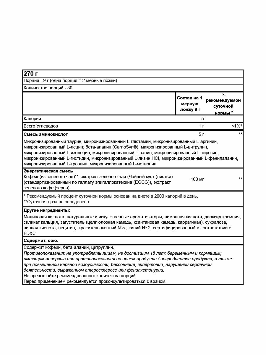 Прекрасно размешивается; Эффективность, отличная комбинация бета-аланина, кофеина и аминокислот. |