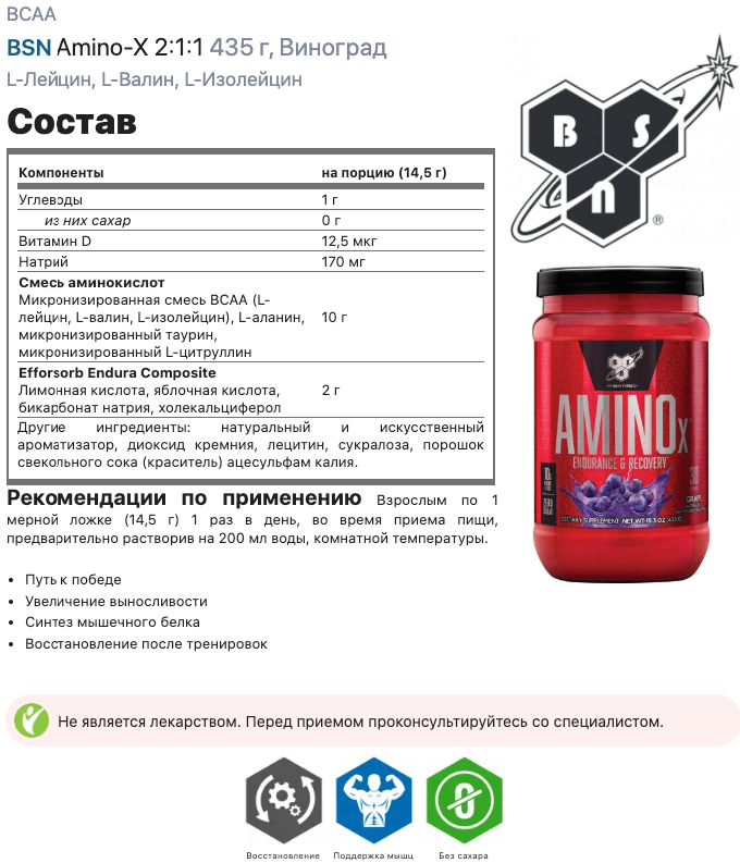 | Плюсы: | Хорошие аминокислоты, рабочие, проверенный производитель |
