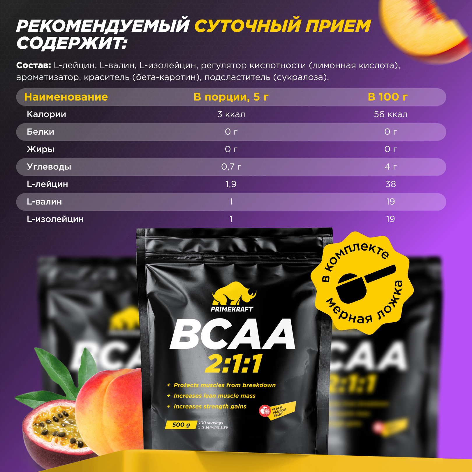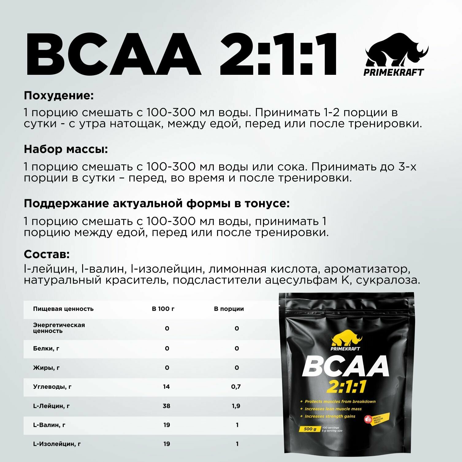 Купить BCAA спорт питание порошок 500 гр, PrimeKraft BCAA 2:1:1 , вкус: - персик , маракуйя