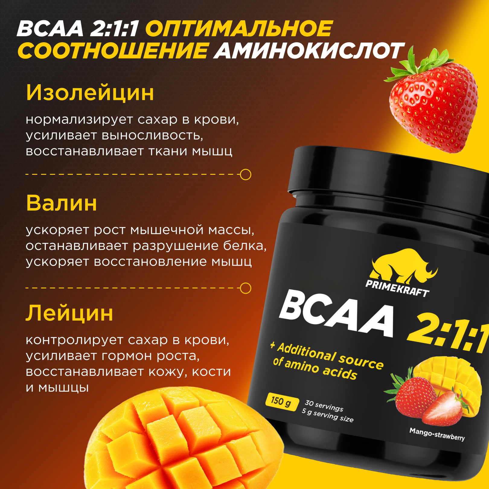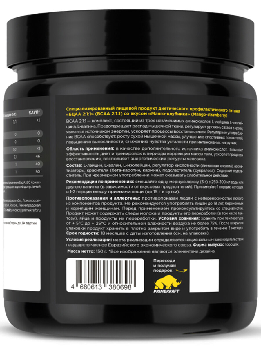 Купить Аминокислоты PRIMEKRAFT BCAA 2:1:1 (БЦАА) Манго-клубника, 150 г / 30 servings