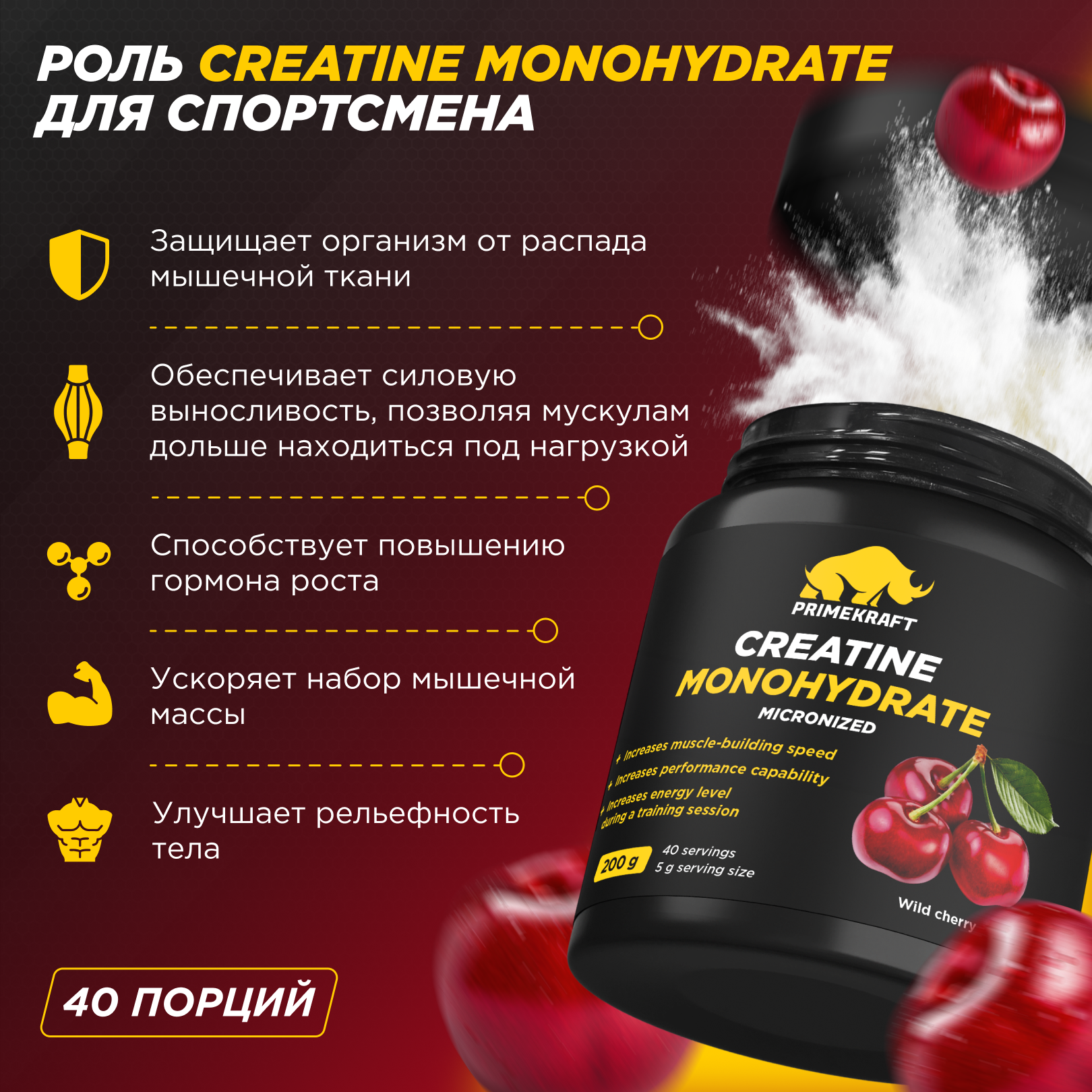 Креатин Моногидрат Микронизированный PRIMEKRAFT Creatine Monohydrate Micronized, Дикая вишня, банка 200 гр / 40 порций