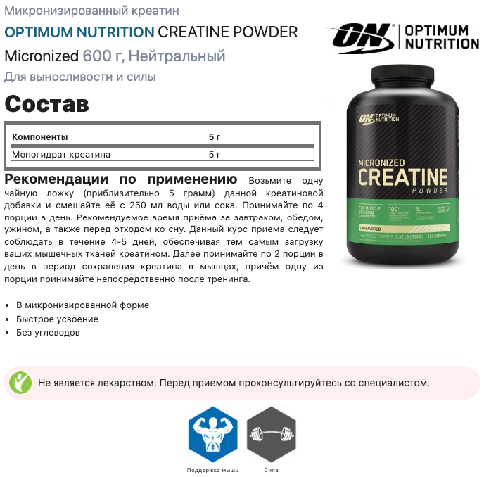 Ниже Вы можете прочитать отзывы на Micronized Creatine Powder 600 гр. (Optimum Nutrition), ознакомится с подробными характеристиками, посмотреть интересные обзоры и фотографии на Micronized Creatine Powder 600 гр. (Optimum Nutrition).