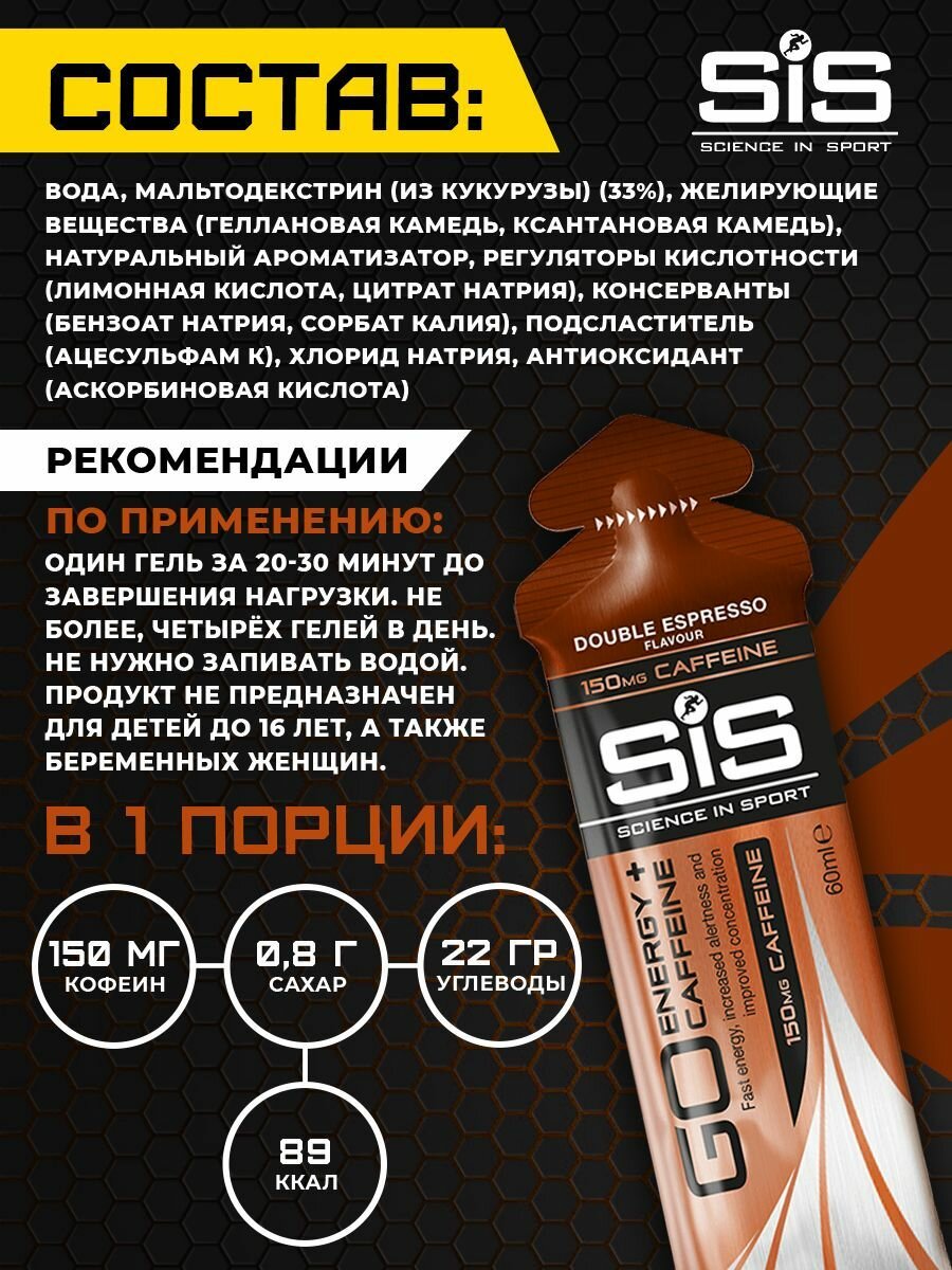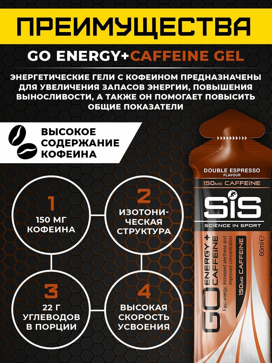 СохранитьЭнергетический гель с кофеином 150мг SiS,GO ENERGY+CAFFEINE GEL 6шт по 60мл (Двойной эспрессо) интересное: