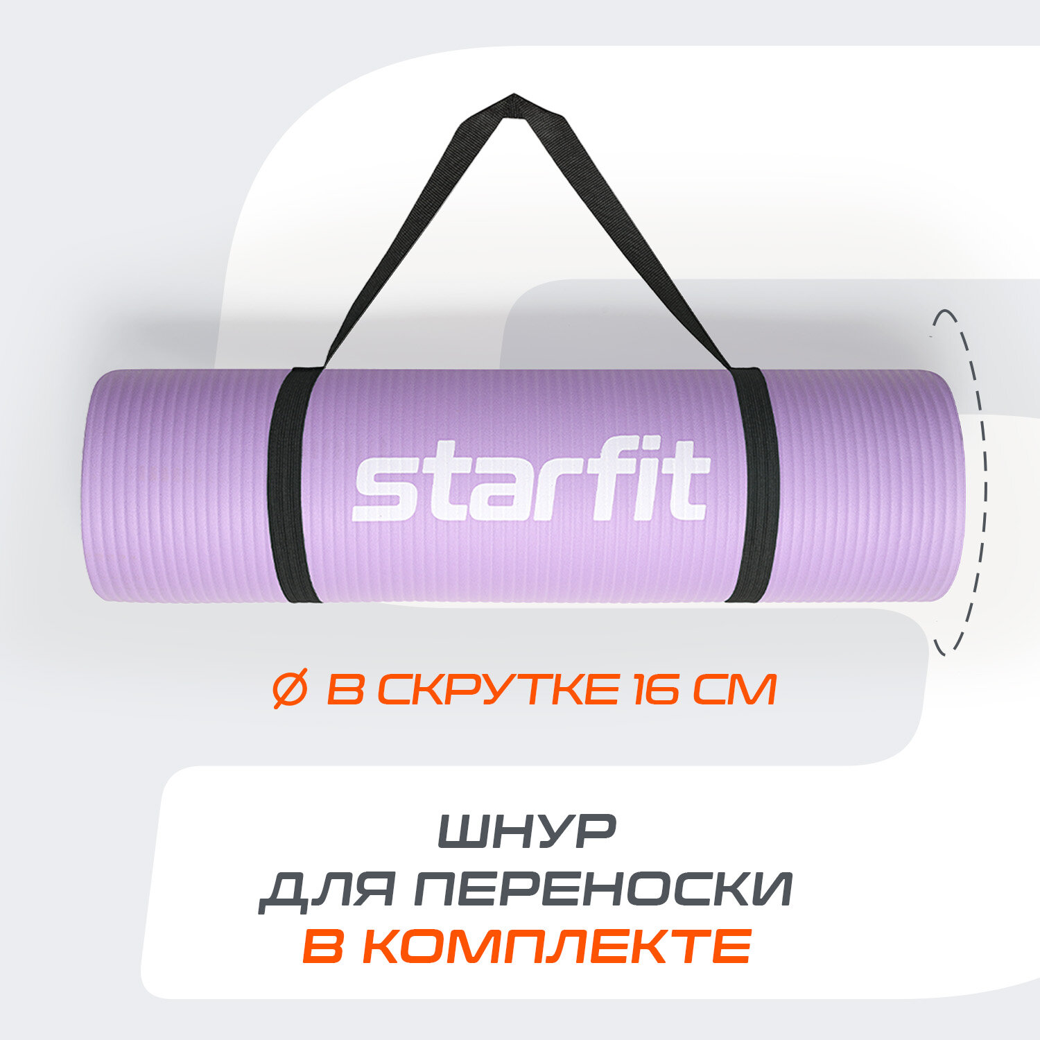Коврик для йоги фитнеса STARFIT FM-301 NBR, 1,0 см, 183x61 см лиловый с шнурком для переноски