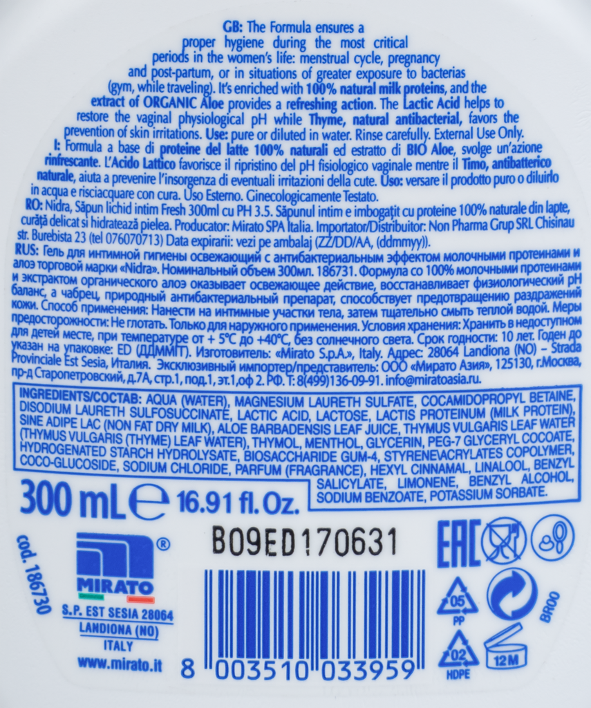 | Плюсы: | Хорошее средство. Пенится в меру, дискомфорта при использовании не вызывает, кожу не сушит. Консистенция довольно жидкая, гелеобразная, pH средства оптимальный. Увлажнение чувствуется, ощущение свежести после применения тоже присутствует. Запах минимальный, приятный (с молочными оттенками). Расход экономичный, объём флакона большой (500 мл) по сравнению с большинством средств для интимной гигиены. Производство Италия |