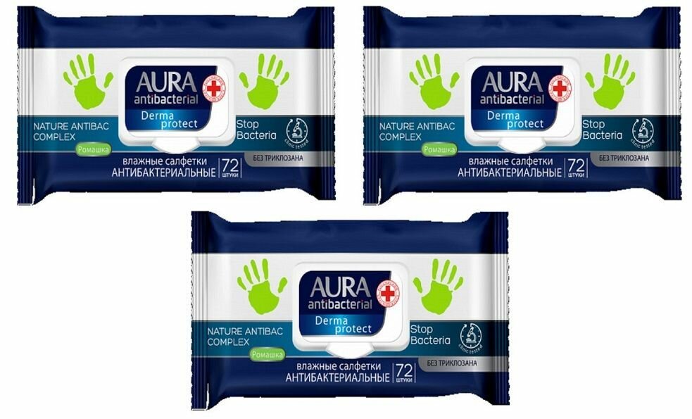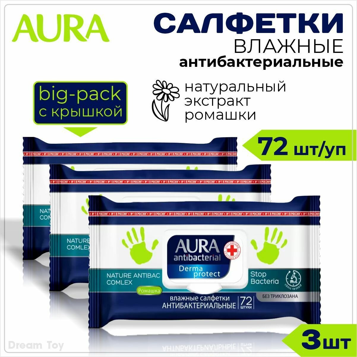 AURA Влажные салфетки антибактериальные Derma Protect ромашка big-pack с крышкой 72 шт.*3 упак.